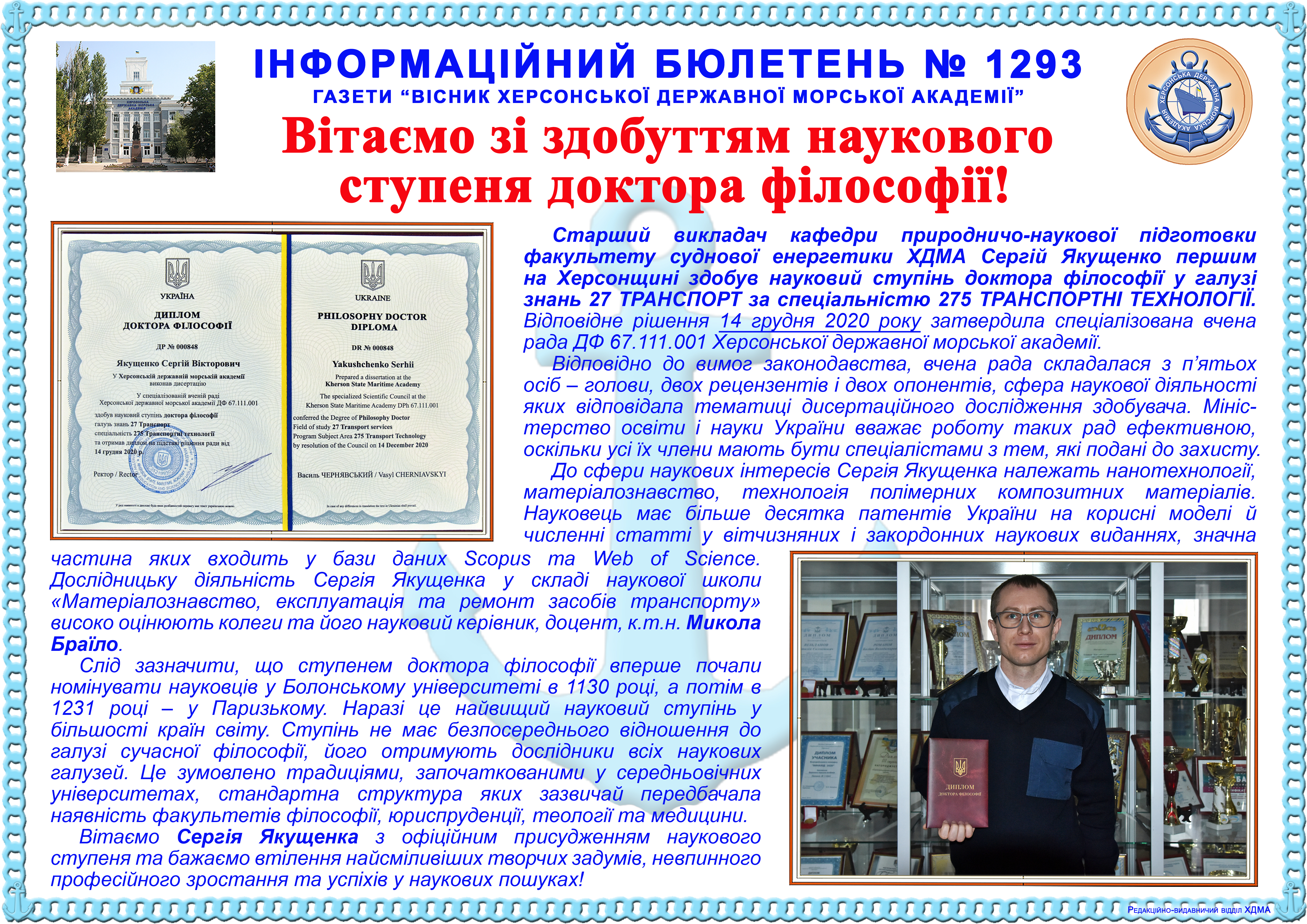 http://repnew.ksma.ks.ua/jspui/handle/123456789/1654| Title: | Інформаційний бюлетень № 1293 Вітаємо зі здобуттям наукового ступеня доктора філософії! |