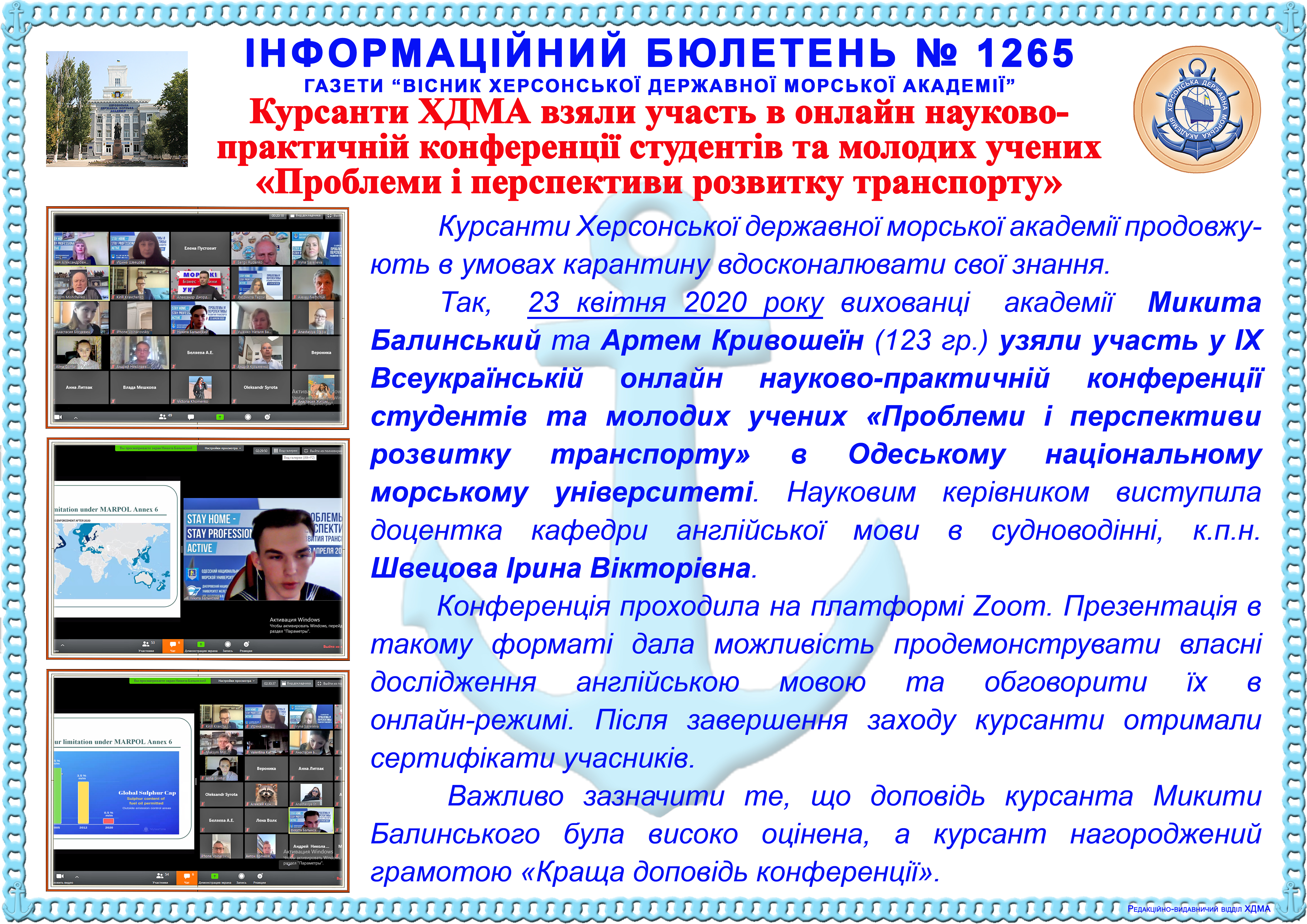 http://repnew.ksma.ks.ua/jspui/handle/123456789/1658| Title: | Інформаційний бюлетень № 1265 Курсанти ХДМА взяли участь в онлайн науково-практичній конференції студентів та молодих учених «Проблеми і перспективи розвитку транспорту» |
