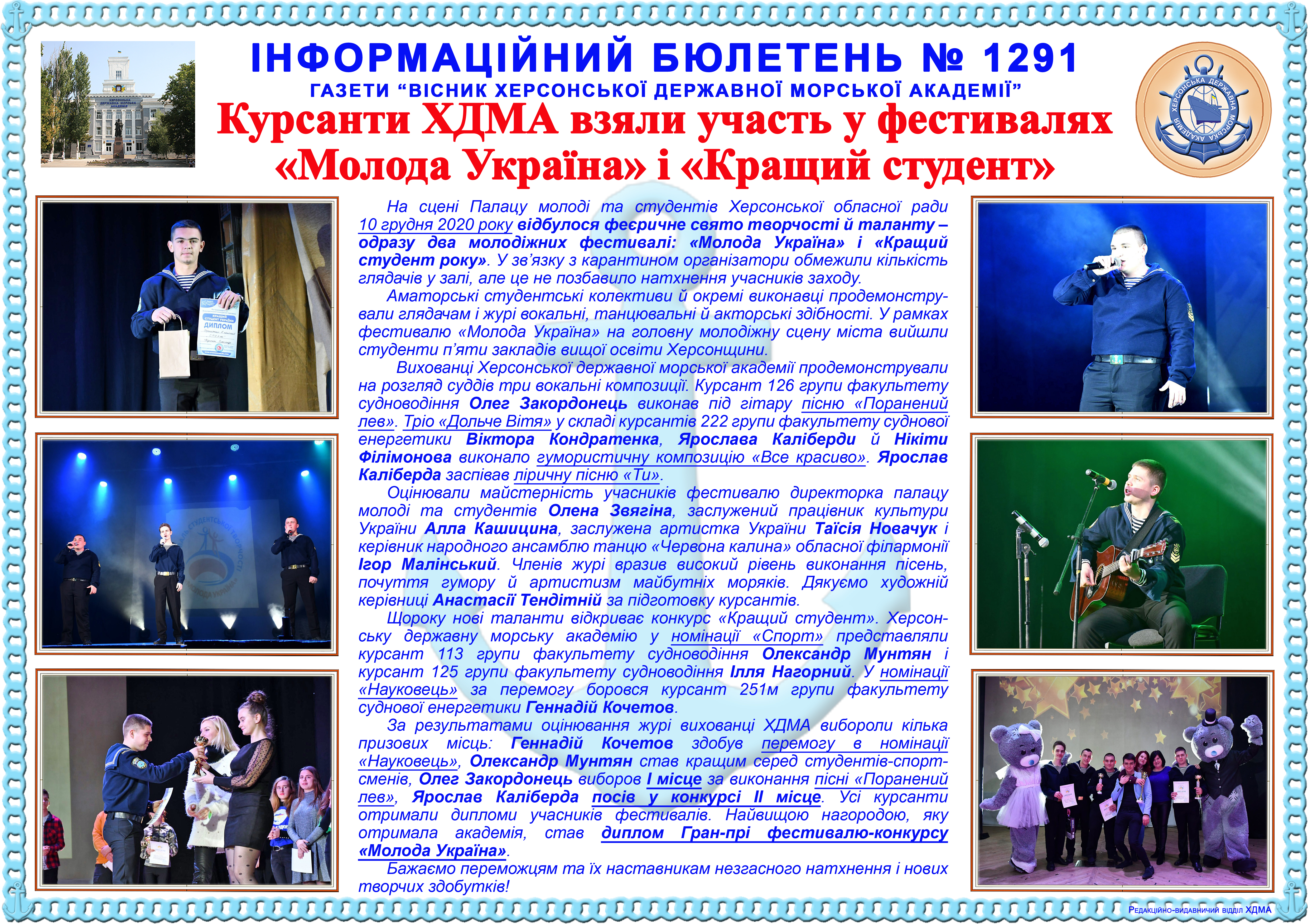 http://repnew.ksma.ks.ua/jspui/handle/123456789/1660| Title: | Інформаційний бюлетень № 1291 Курсанти Херсонської державної морської академії взяли участь у фестивалях «Молода Україна» і «Кращий студент» |