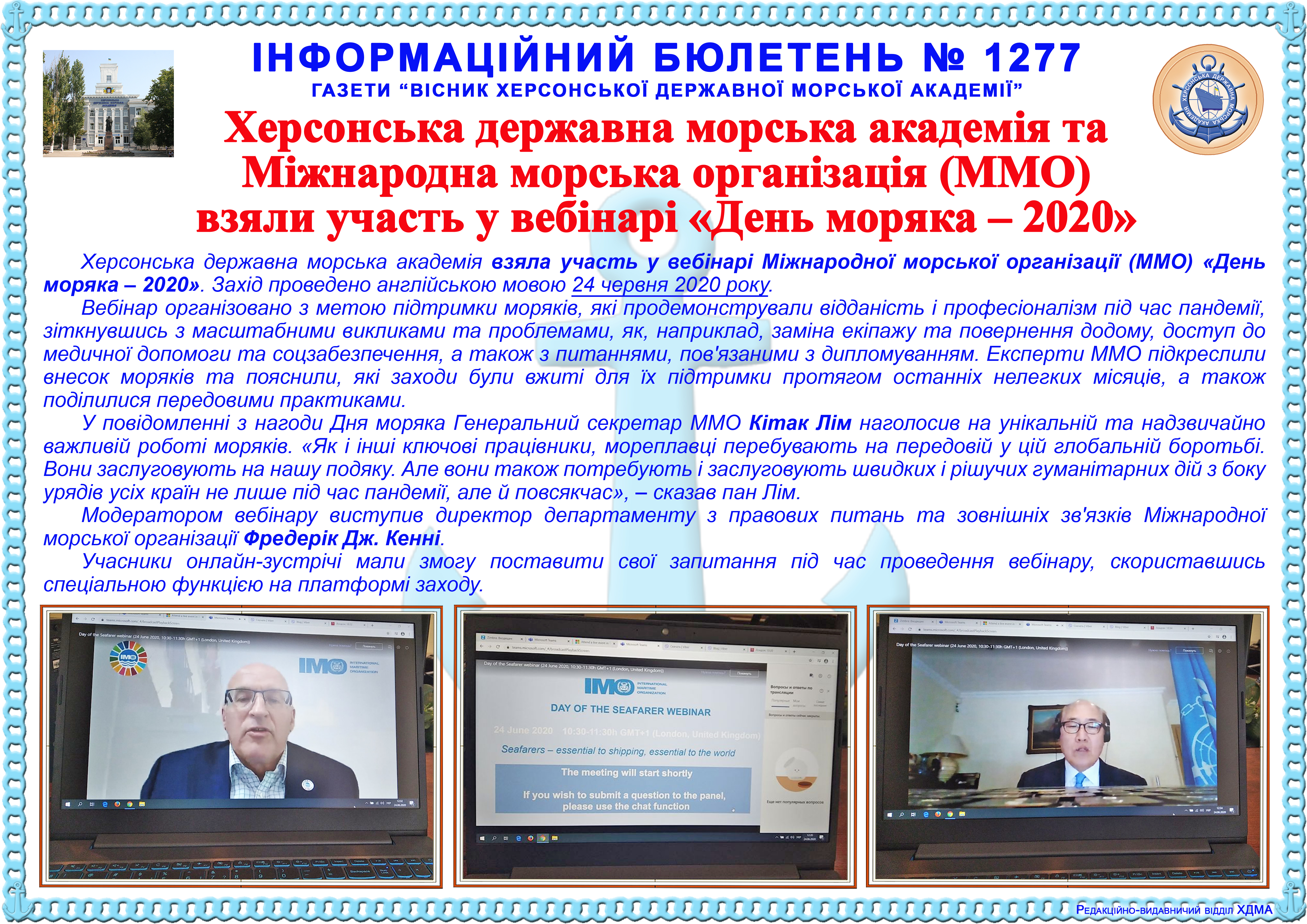 http://repnew.ksma.ks.ua/jspui/handle/123456789/1680| Title: | Інформаційний бюлетень № 1277 Херсонська державна морська академія та Міжнародна морська організація (ММО) взяли участь у вебінарі «День моряка – 2020» |