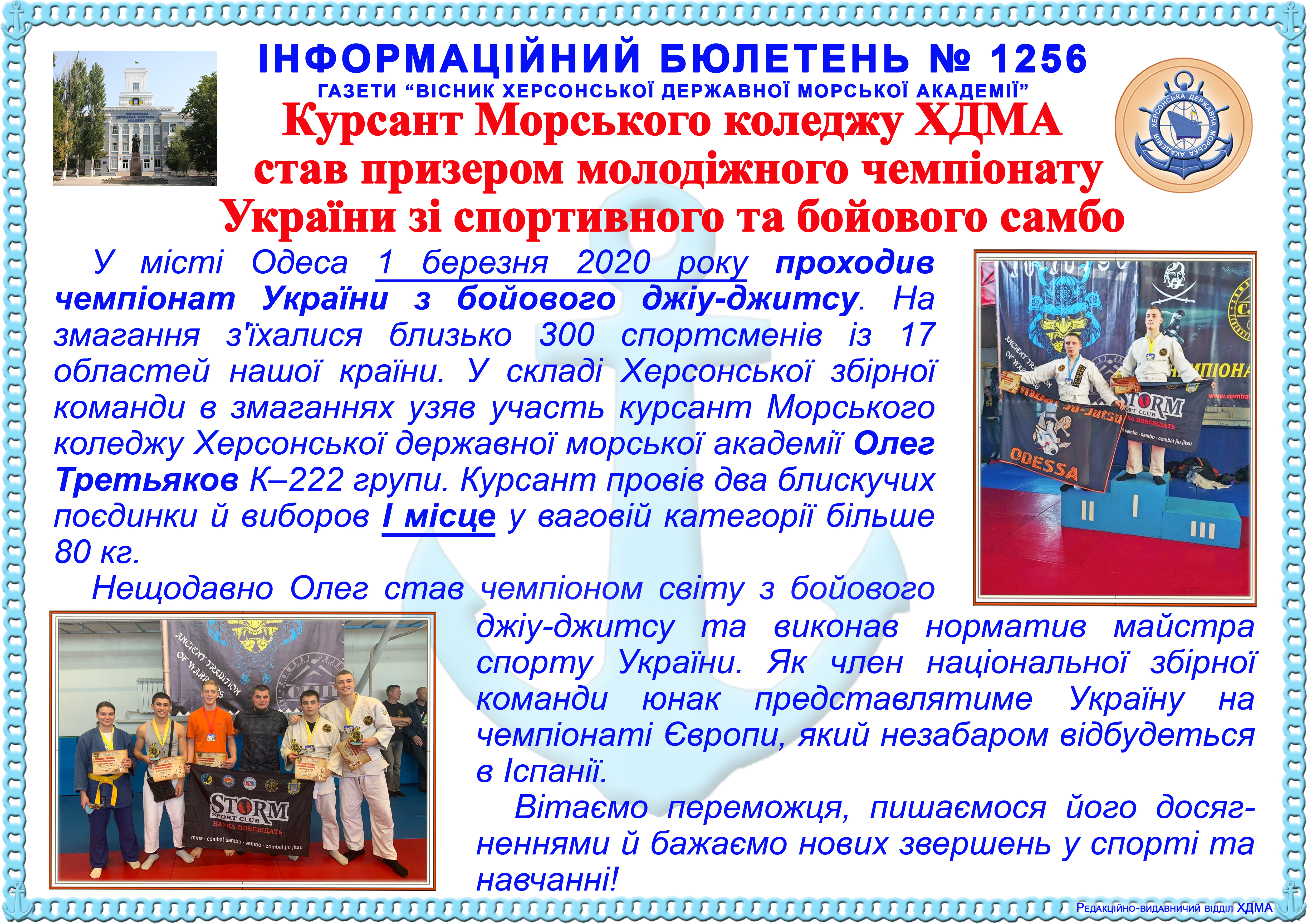 http://repnew.ksma.ks.ua/jspui/handle/123456789/1685| Title: | Інформаційний бюлетень № 1256 Курсант Морського коледжу Херсонської державної морської академії – чемпіон України |