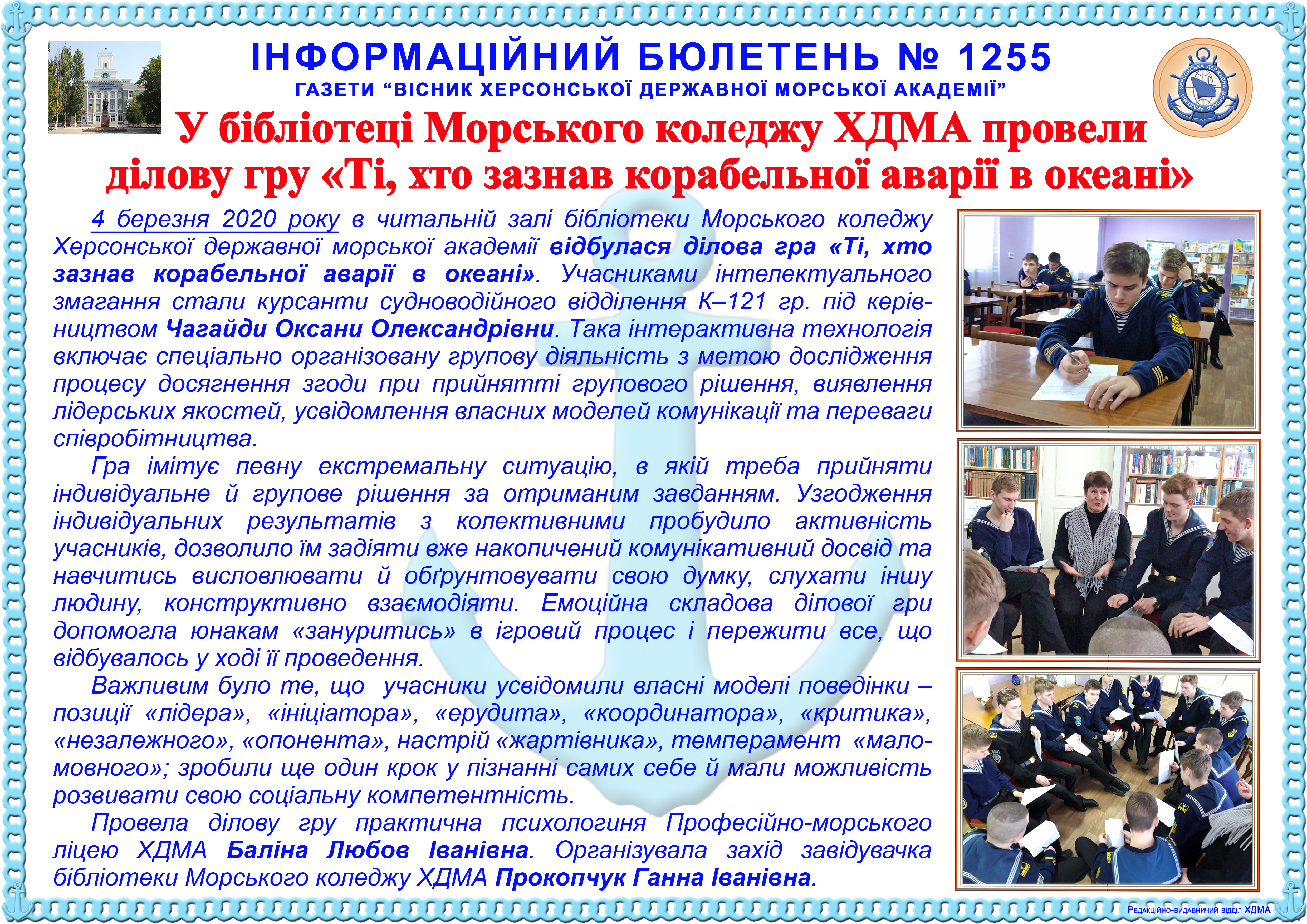 http://repnew.ksma.ks.ua/jspui/handle/123456789/1688| Title: | Інформаційний бюлетень № 1255 У бібліотеці Морського коледжу ХДМА провели ділову гру «Ті, хто зазнав корабельної аварії в океані» |