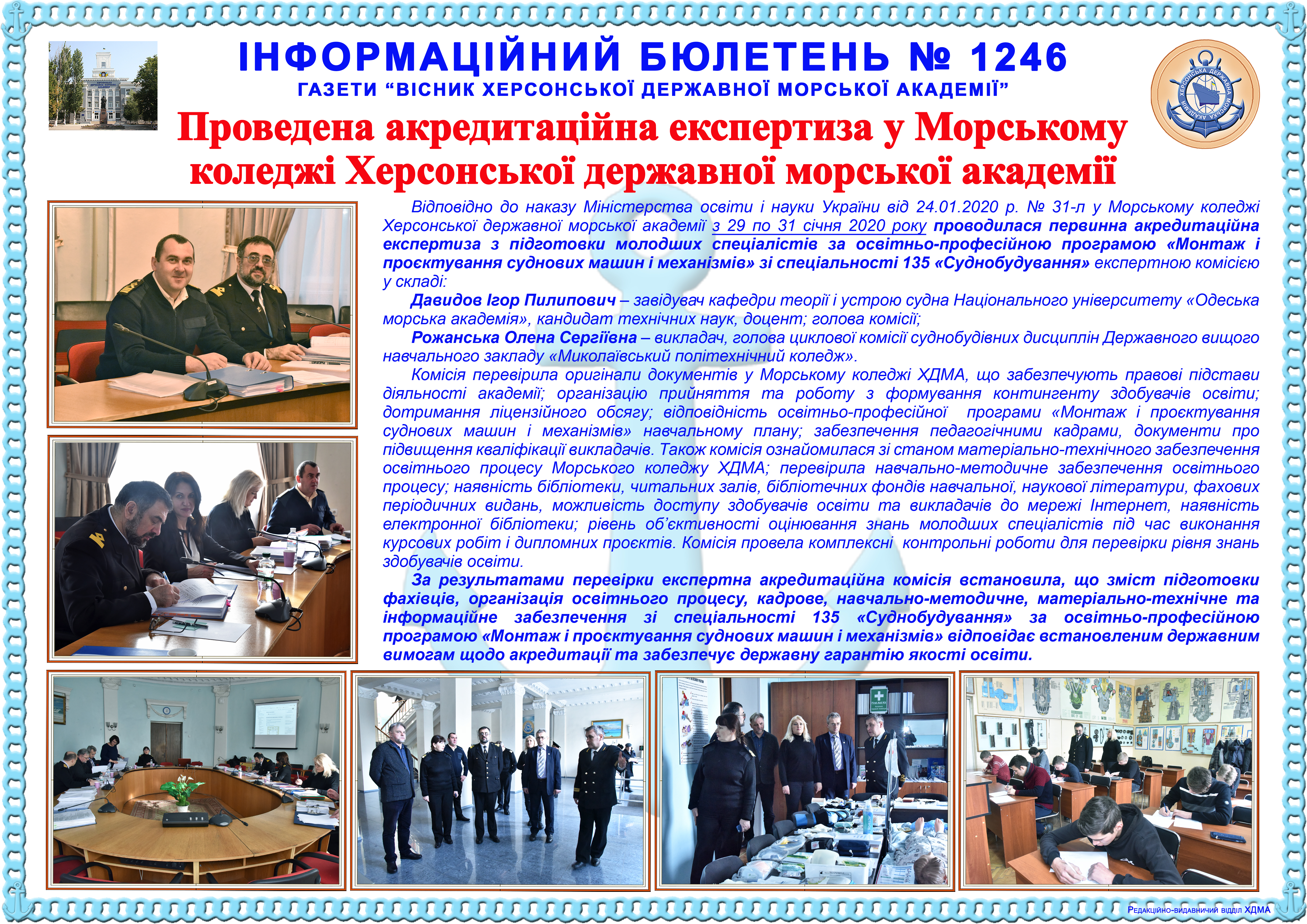http://repnew.ksma.ks.ua/jspui/handle/123456789/1697| Title: | Інформаційний бюлетень № 1246 Проведена акредитаційна експертиза у Морському коледжі Херсонської державної морської академії |