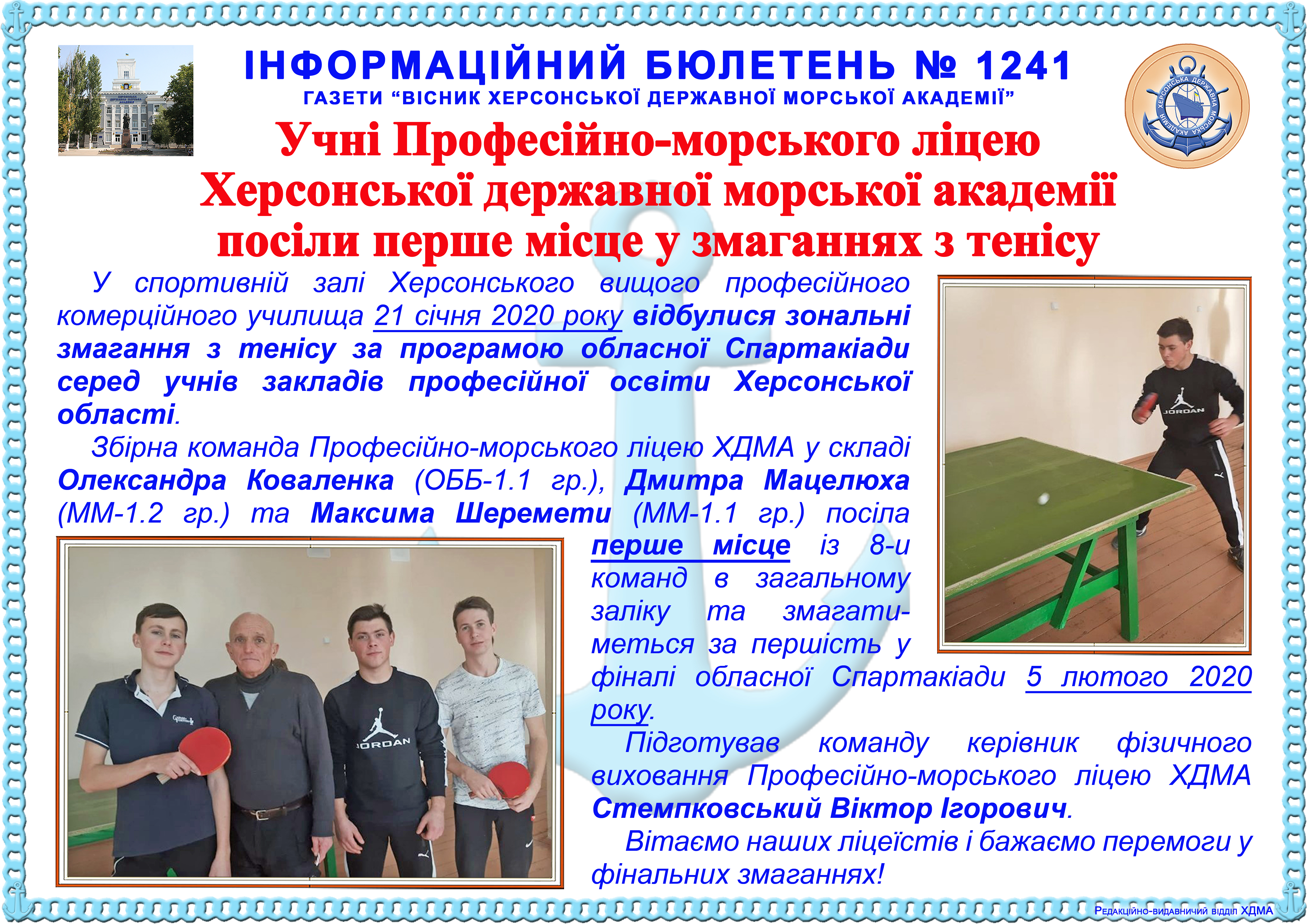 http://repnew.ksma.ks.ua/jspui/handle/123456789/1702| Title: | Інформаційний бюлетень № 1241 Учні Професійно-морського ліцею Херсонської державної морської академії посіли перше місце у змаганнях з тенісу |