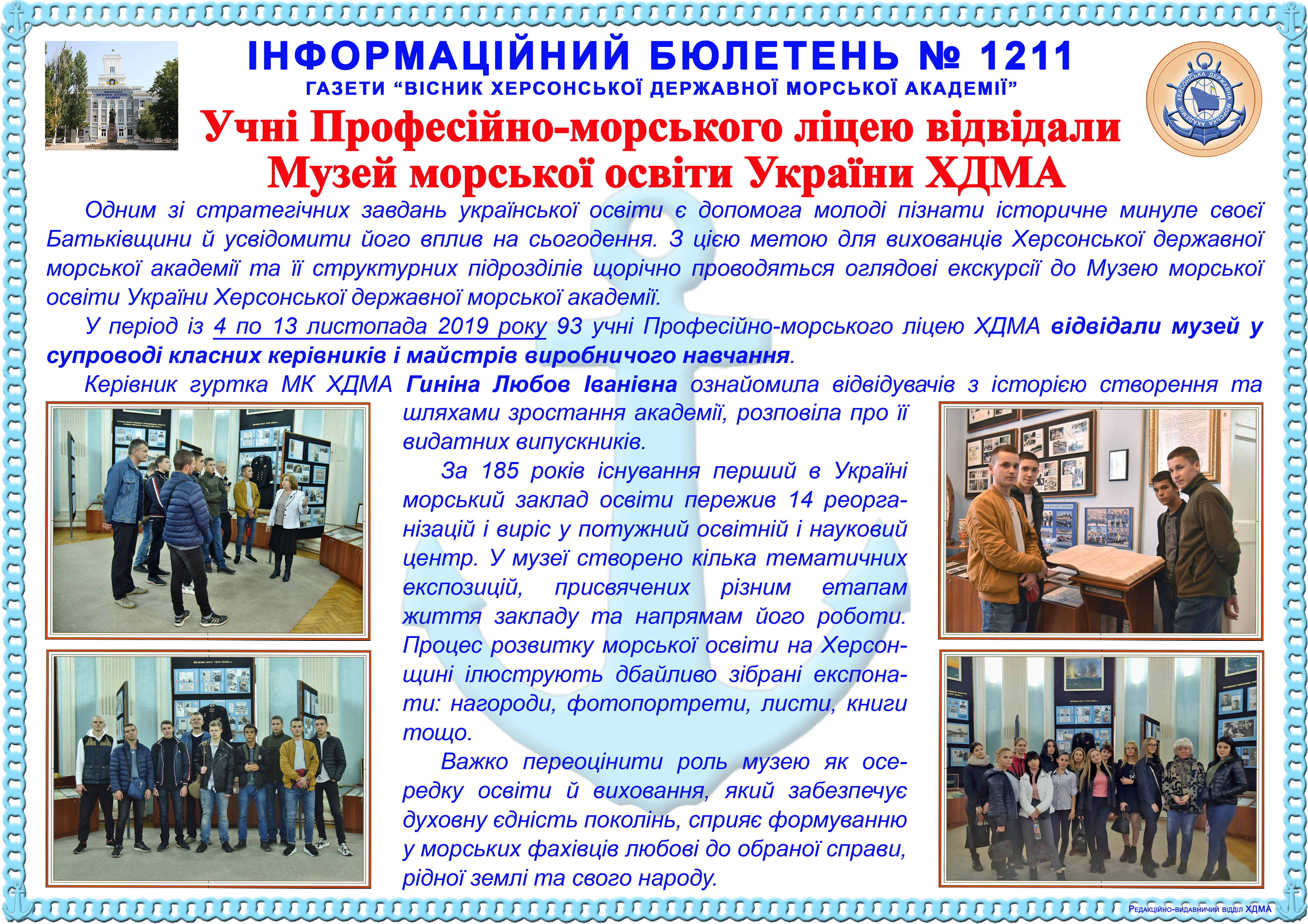 http://repnew.ksma.ks.ua/jspui/handle/123456789/1777| Title: | Інформаційний бюлетень № 1211 Учні Професійно-морського ліцею відвідали Музей морської освіти України ХДМА |