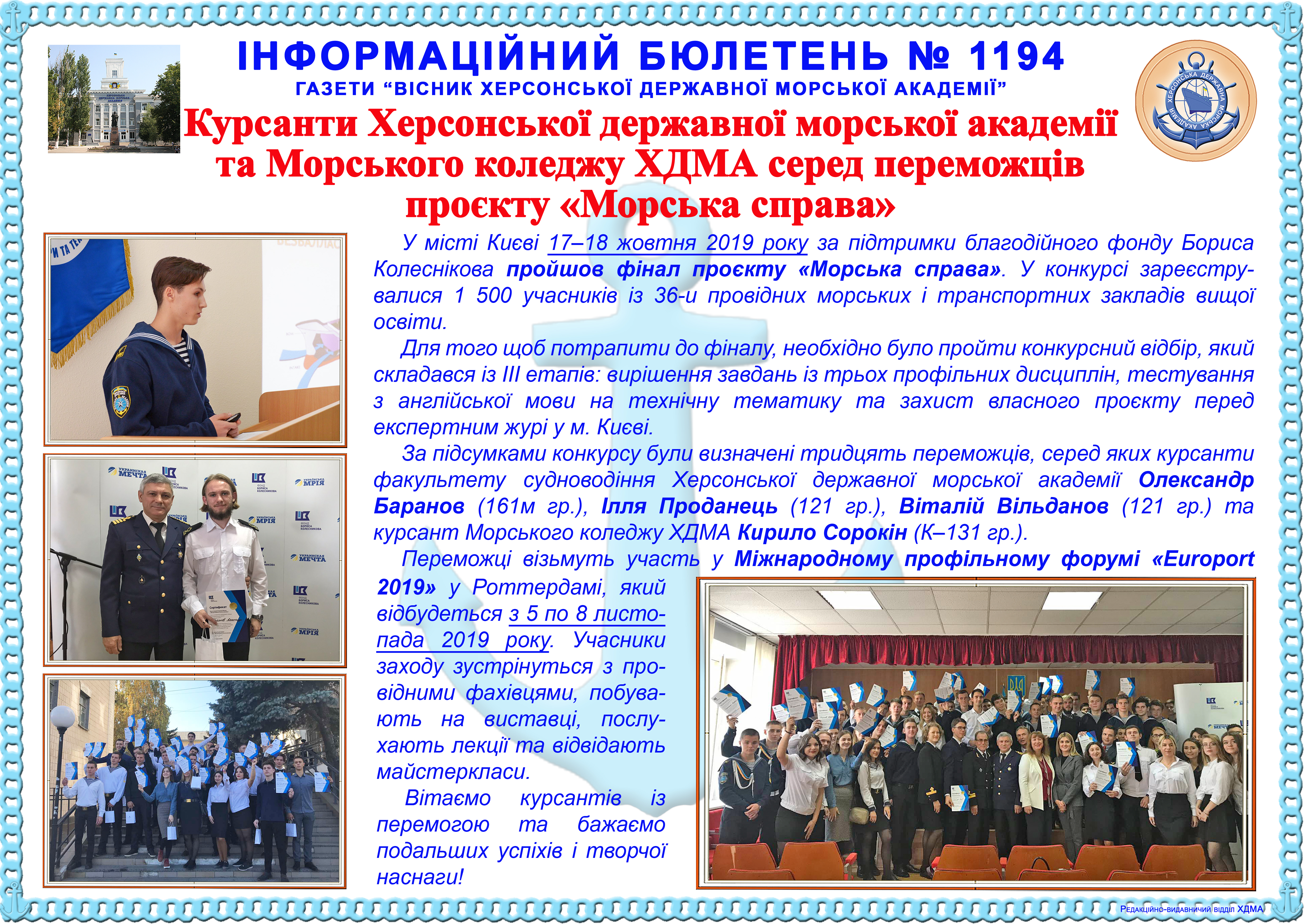 Title: Інформаційний бюлетень № 1194 Курсанти Херсонської державної морської академії та Морського коледжу ХДМА серед переможців проєкту «Морська справа»