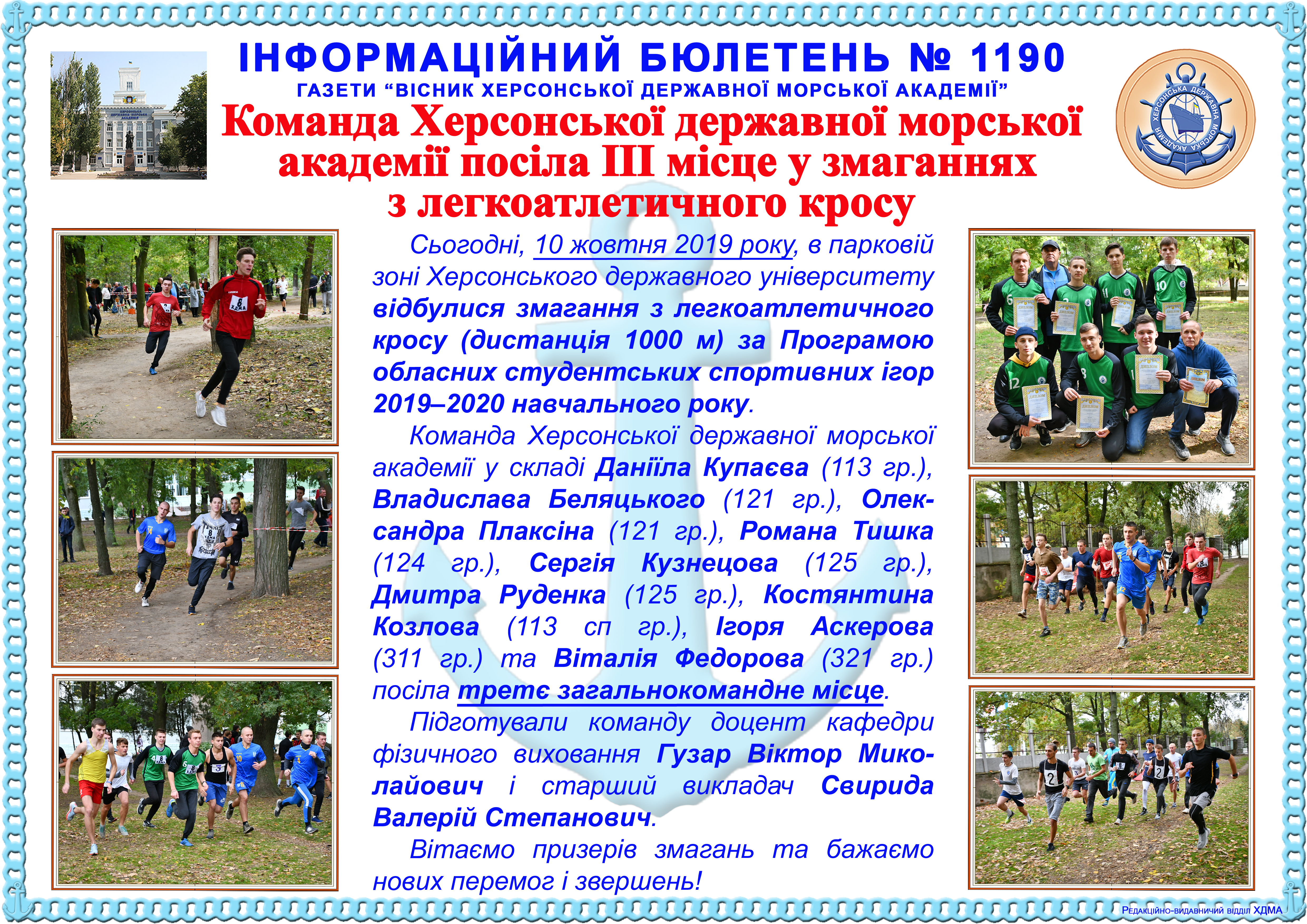 http://repnew.ksma.ks.ua/jspui/handle/123456789/1805| Title: | Інформаційний бюлетень № 1190 Команда Херсонської державної морської академії посіла ІІІ місце у змаганнях з легкоатлетичного кросу |