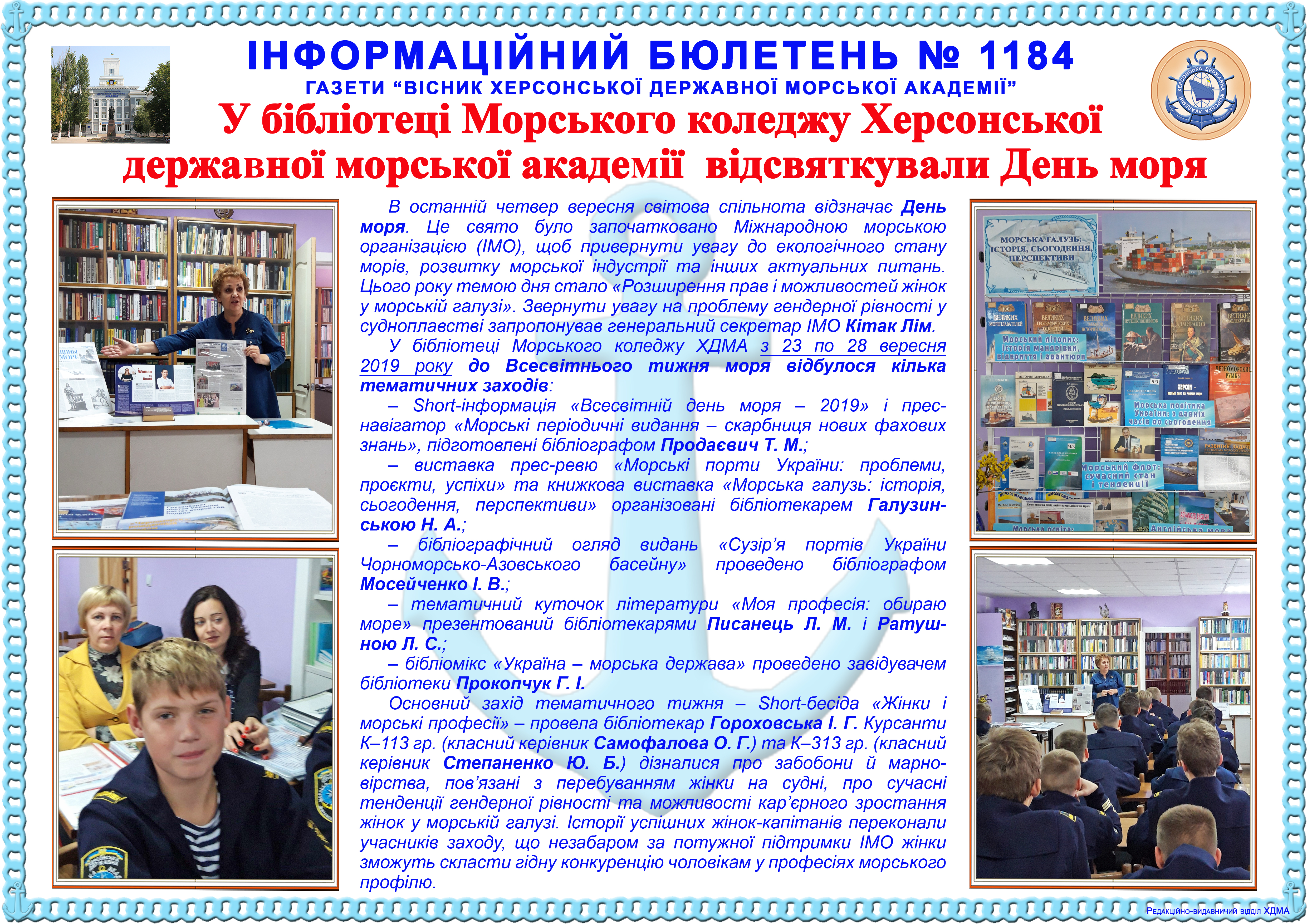 http://repnew.ksma.ks.ua/jspui/handle/123456789/1810| Title: | Інформаційний бюлетень № 1184 У бібліотеці Морського коледжу Херсонської державної морської академії відсвяткували День моря |
