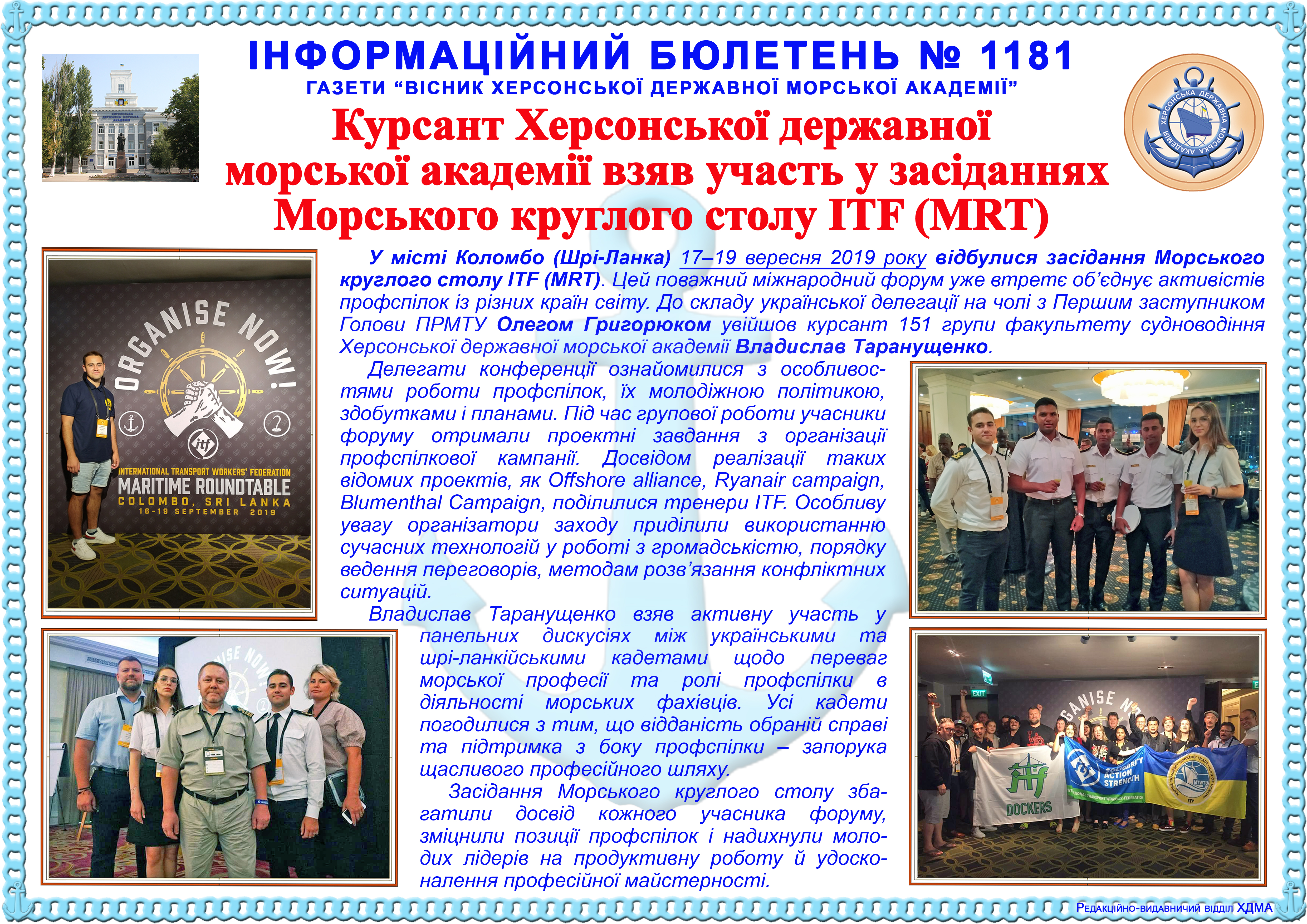http://repnew.ksma.ks.ua/jspui/handle/123456789/1813| Title: | Інформаційний бюлетень № 1181 Курсант Херсонської державної морської академії взяв участь у засіданнях Морського круглого столу ITF (MRT) |
