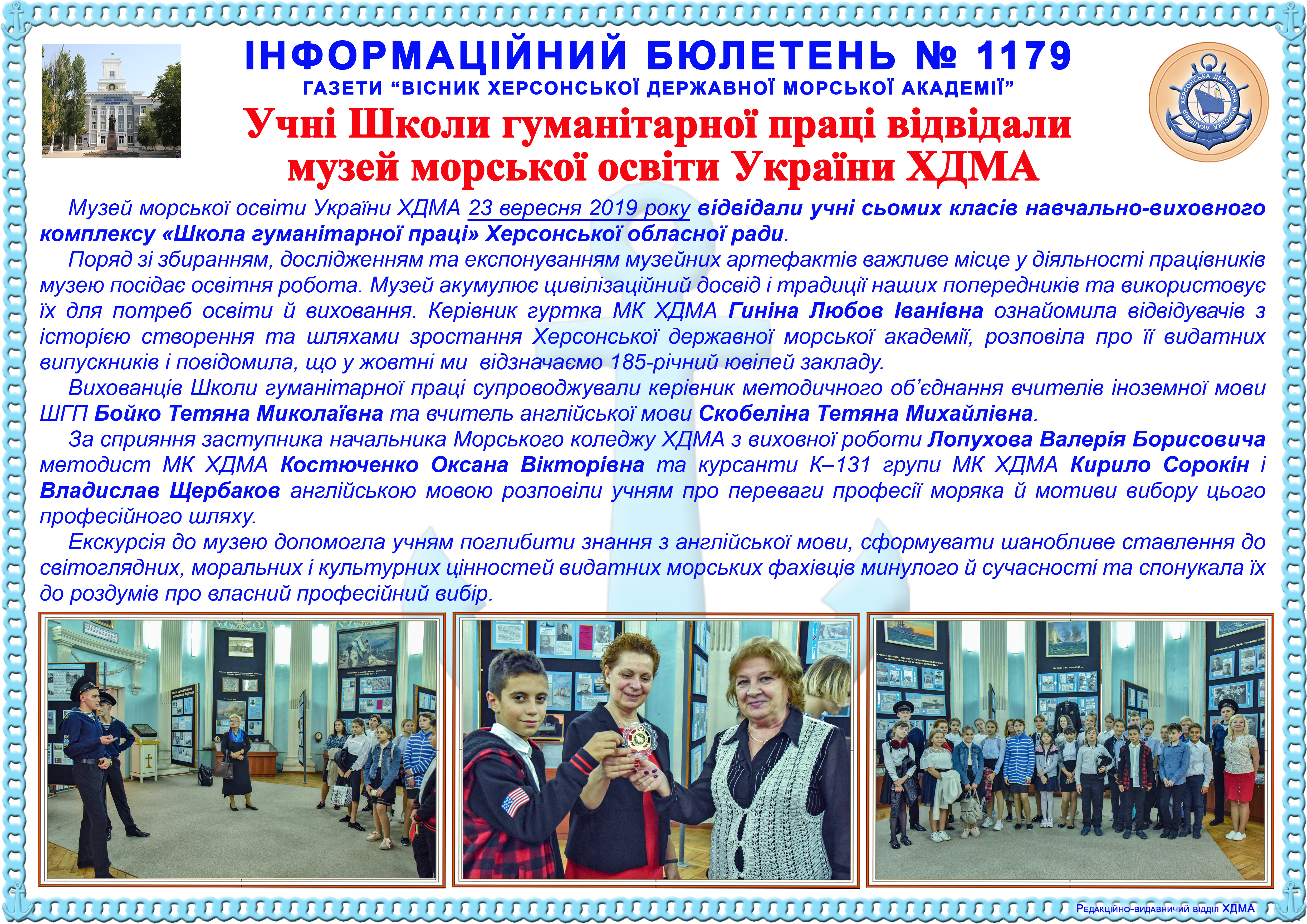 http://repnew.ksma.ks.ua/jspui/handle/123456789/1815| Title: | Інформаційний бюлетень № 1179 Учні Школи гуманітарної праці відвідали музей морської освіти України ХДМА |