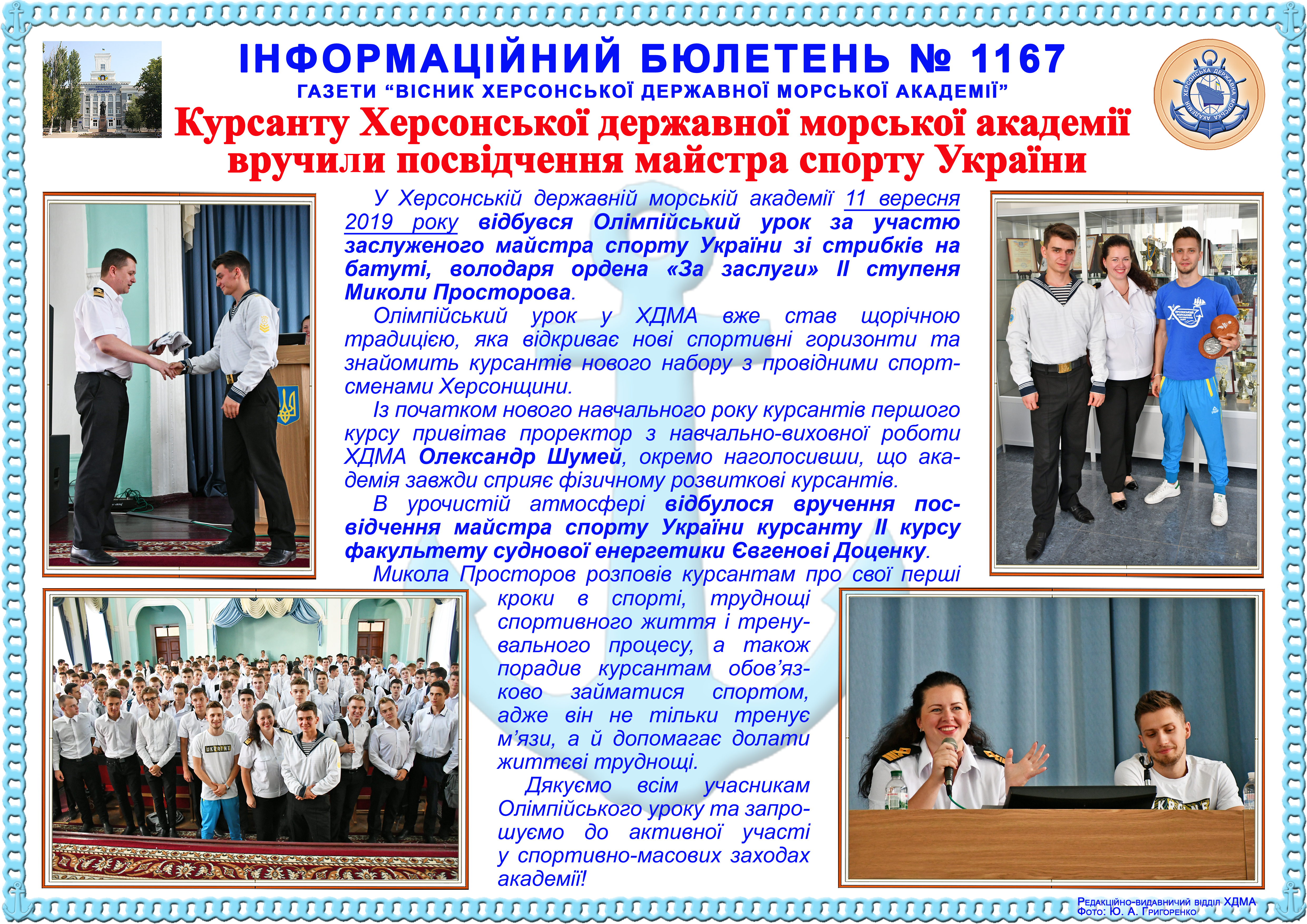 Title: Інформаційний бюлетень № 1167 Курсанту Херсонської державної морської академії вручили посвідчення майстра спорту України