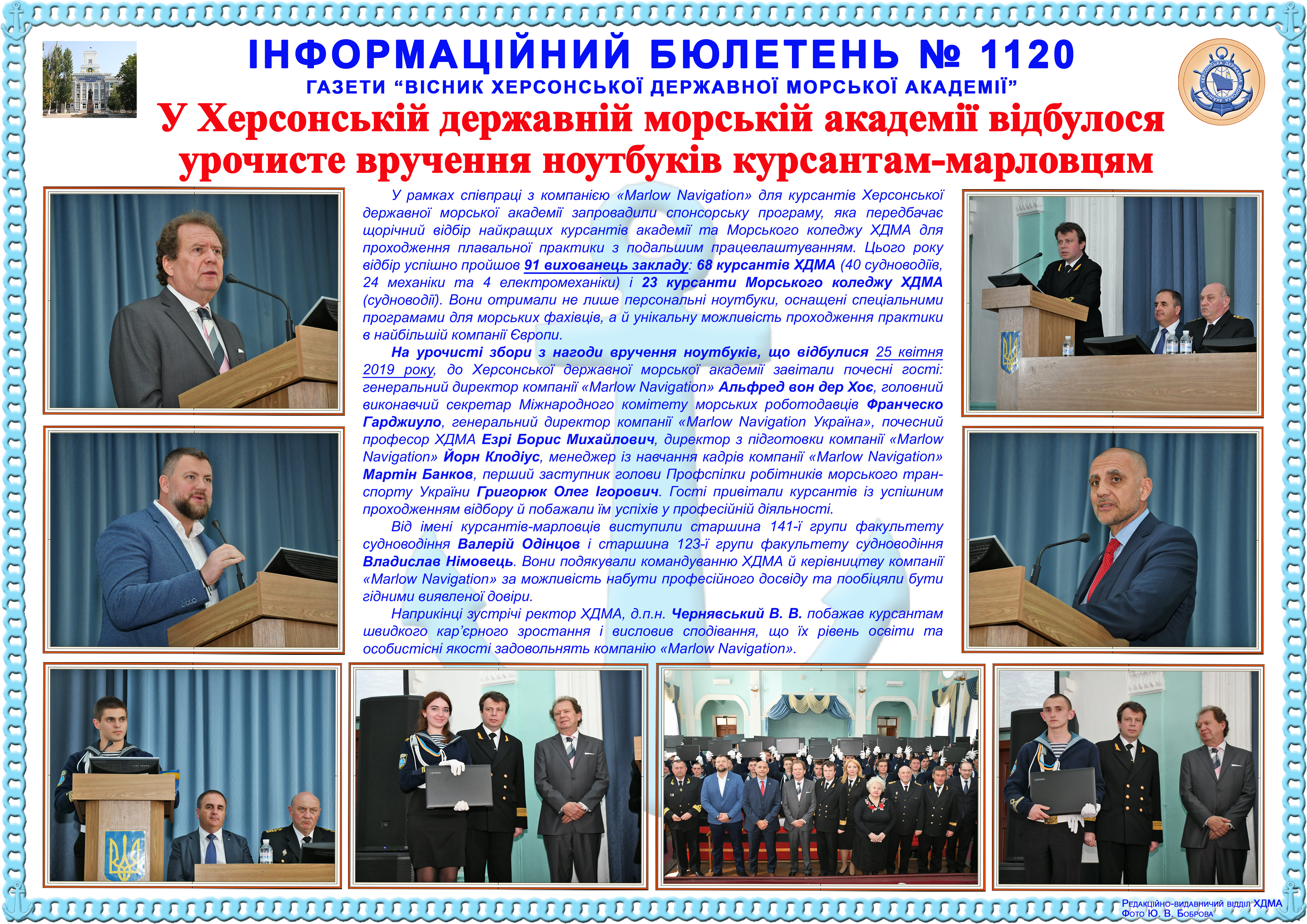 http://repnew.ksma.ks.ua/jspui/handle/123456789/1888| Title: | Інформаційний бюлетень № 1120 У Херсонській державній морській академії відбулося урочисте вручення ноутбуків курсантам-марловцям |