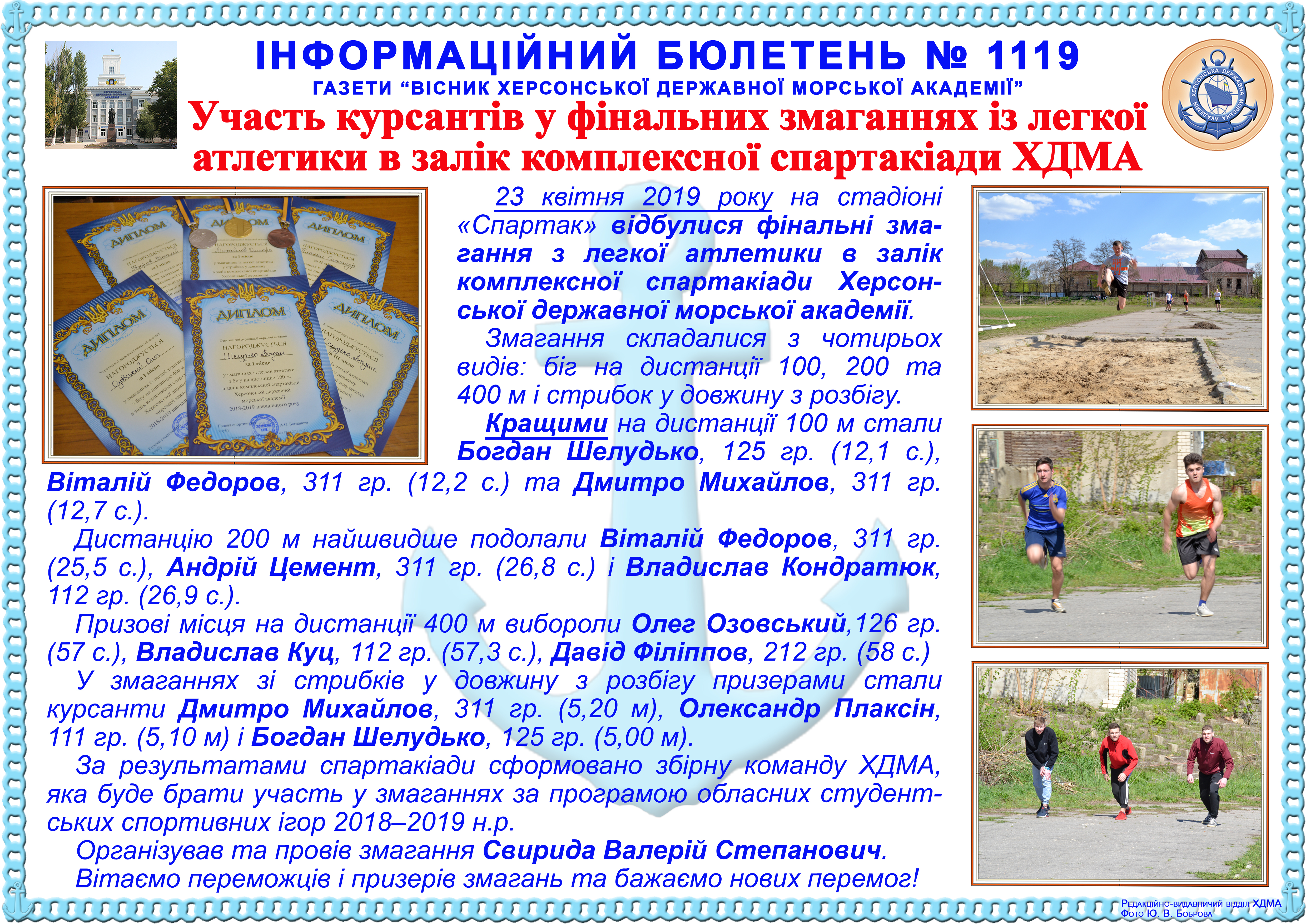 http://repnew.ksma.ks.ua/jspui/handle/123456789/1932| Title: | Інформаційний бюлетень № 1119 Участь курсантів у фінальних змаганнях із легкої атлетики в залік комплексної спартакіади ХДМА |