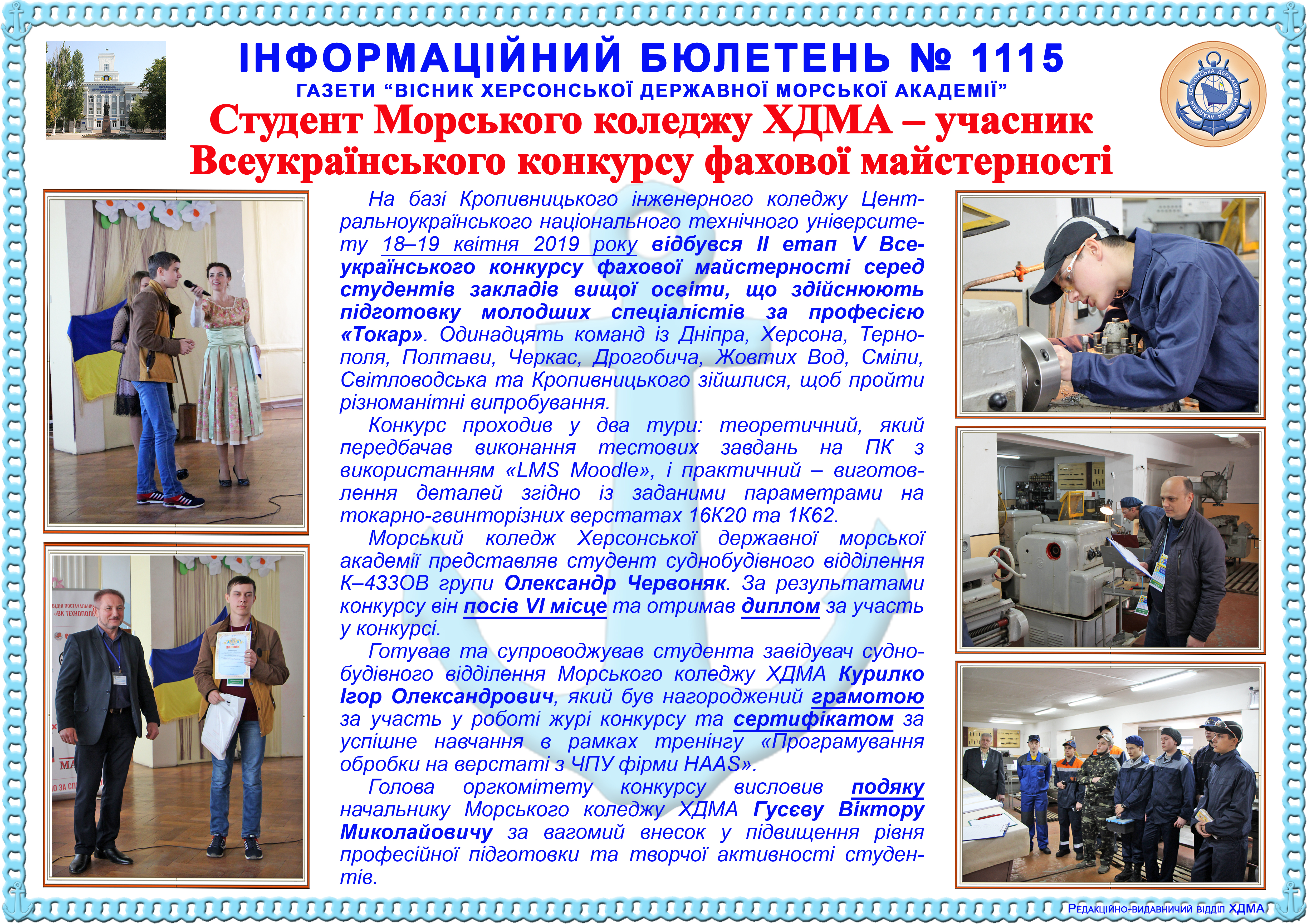 http://repnew.ksma.ks.ua/jspui/handle/123456789/1935| Title: | Інформаційний бюлетень № 1115 Студент Морського коледжу ХДМА – учасник Всеукраїнського конкурсу фахової майстерності |