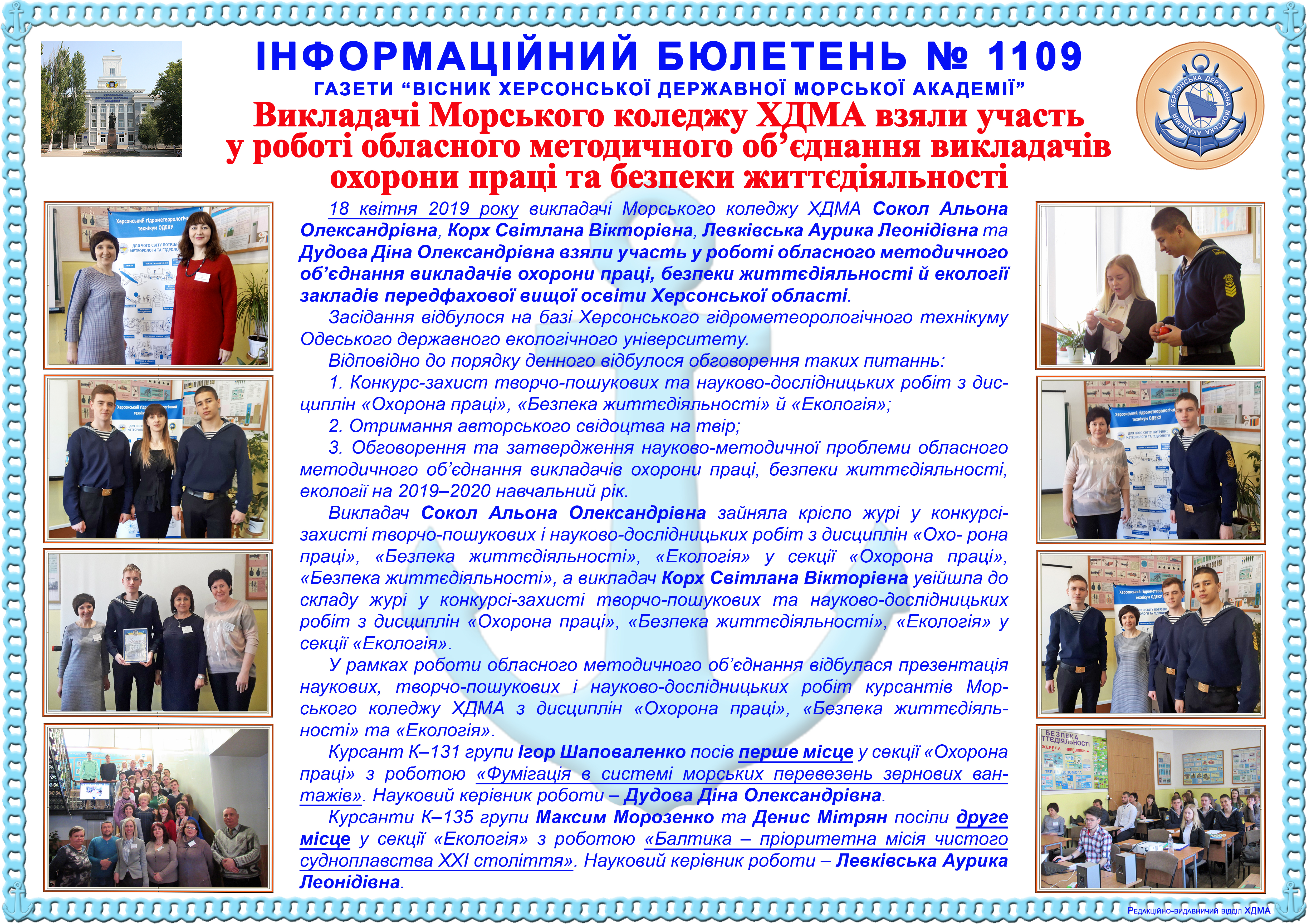 http://repnew.ksma.ks.ua/jspui/handle/123456789/1941| Title: | Інформаційний бюлетень № 1109 Викладачі Морського коледжу ХДМА взяли участь у роботі обласного методичного об’єднання викладачів охорони праці та безпеки життєдіяльності |