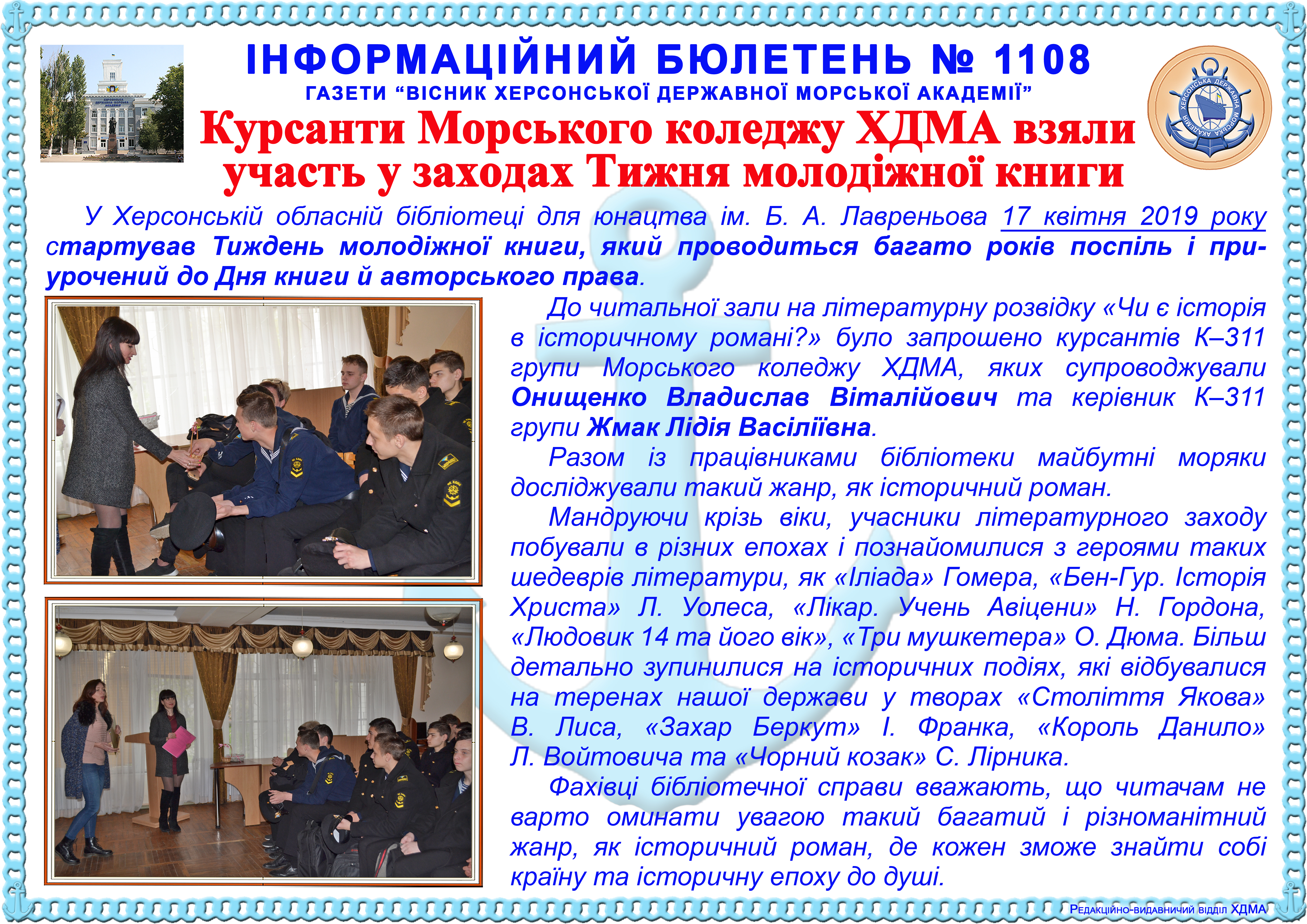 http://repnew.ksma.ks.ua/jspui/handle/123456789/1942| Title: | Інформаційний бюлетень № 1108 Курсанти Морського коледжу ХДМА взяли участь у заходах Тижні молодіжної книги |