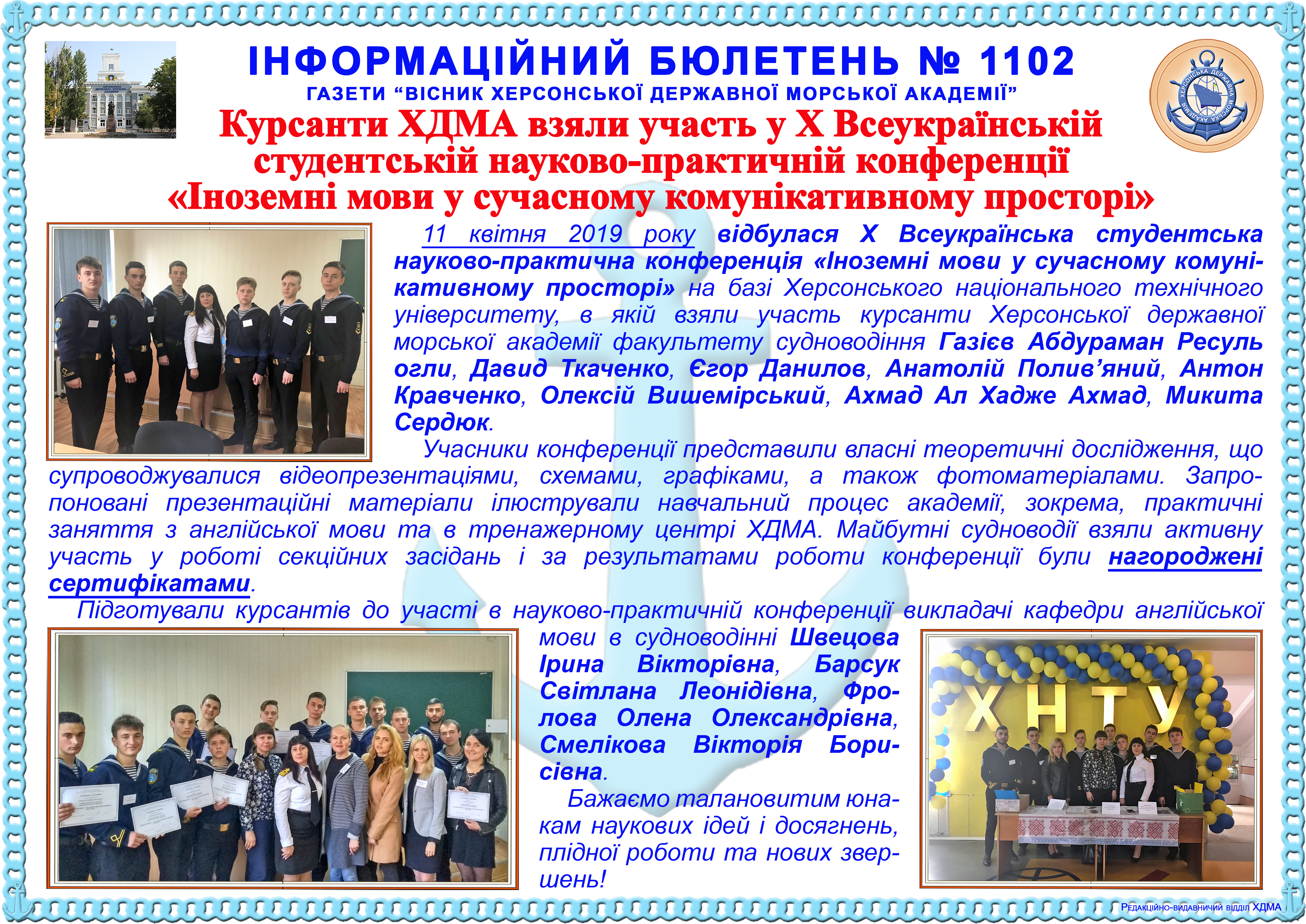 http://repnew.ksma.ks.ua/jspui/handle/123456789/1947| Title: | Інформаційний бюлетень № 1102 Курсанти ХДМА взяли участь у X Всеукраїнській студентській науково-практичній конференції «Іноземні мови у сучасному комунікативному просторі» |