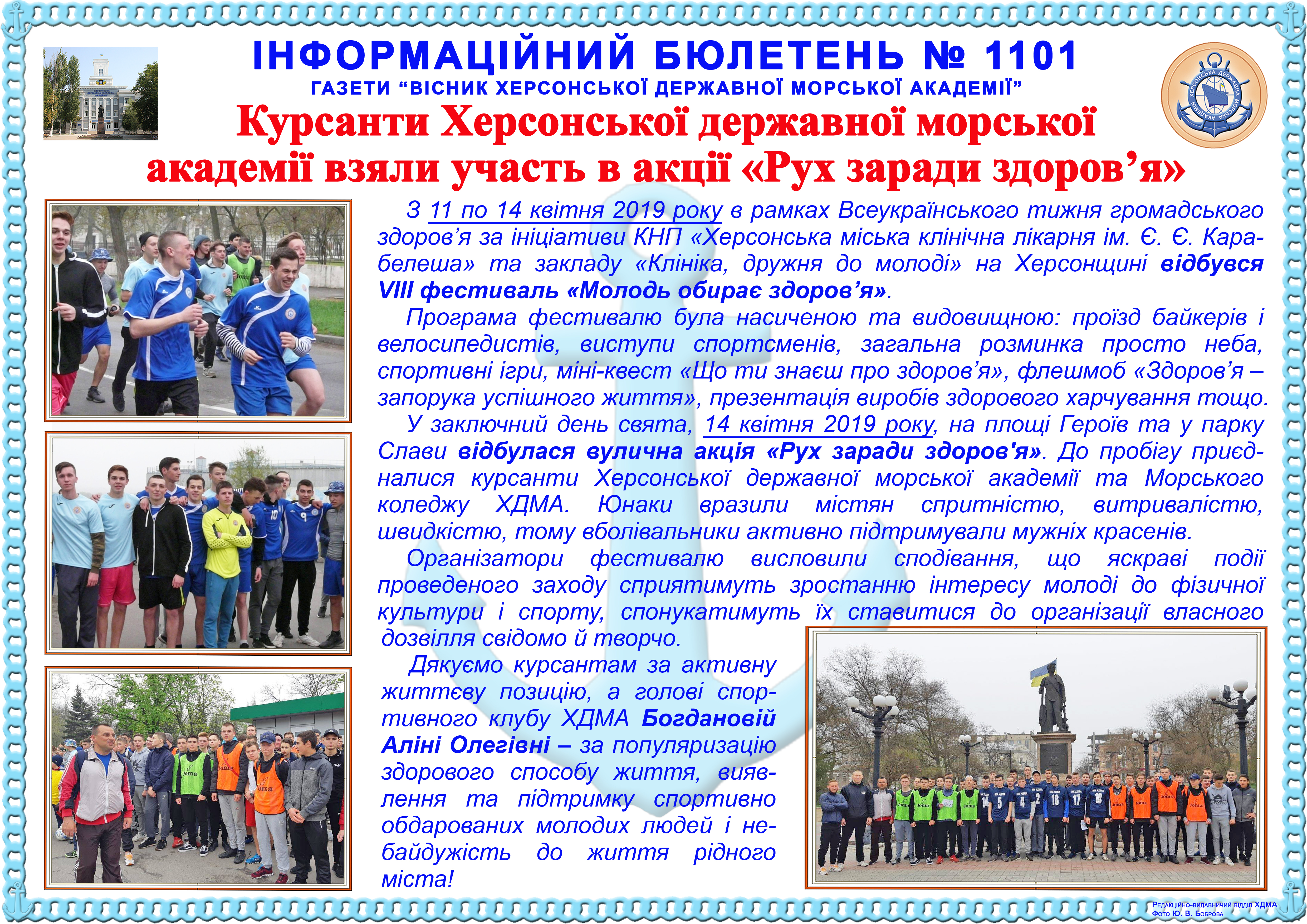 http://repnew.ksma.ks.ua/jspui/handle/123456789/1948| Title: | Інформаційний бюлетень № 1101 Курсанти Херсонської державної морської академії взяли участь в акції «Рух заради здоров’я» |