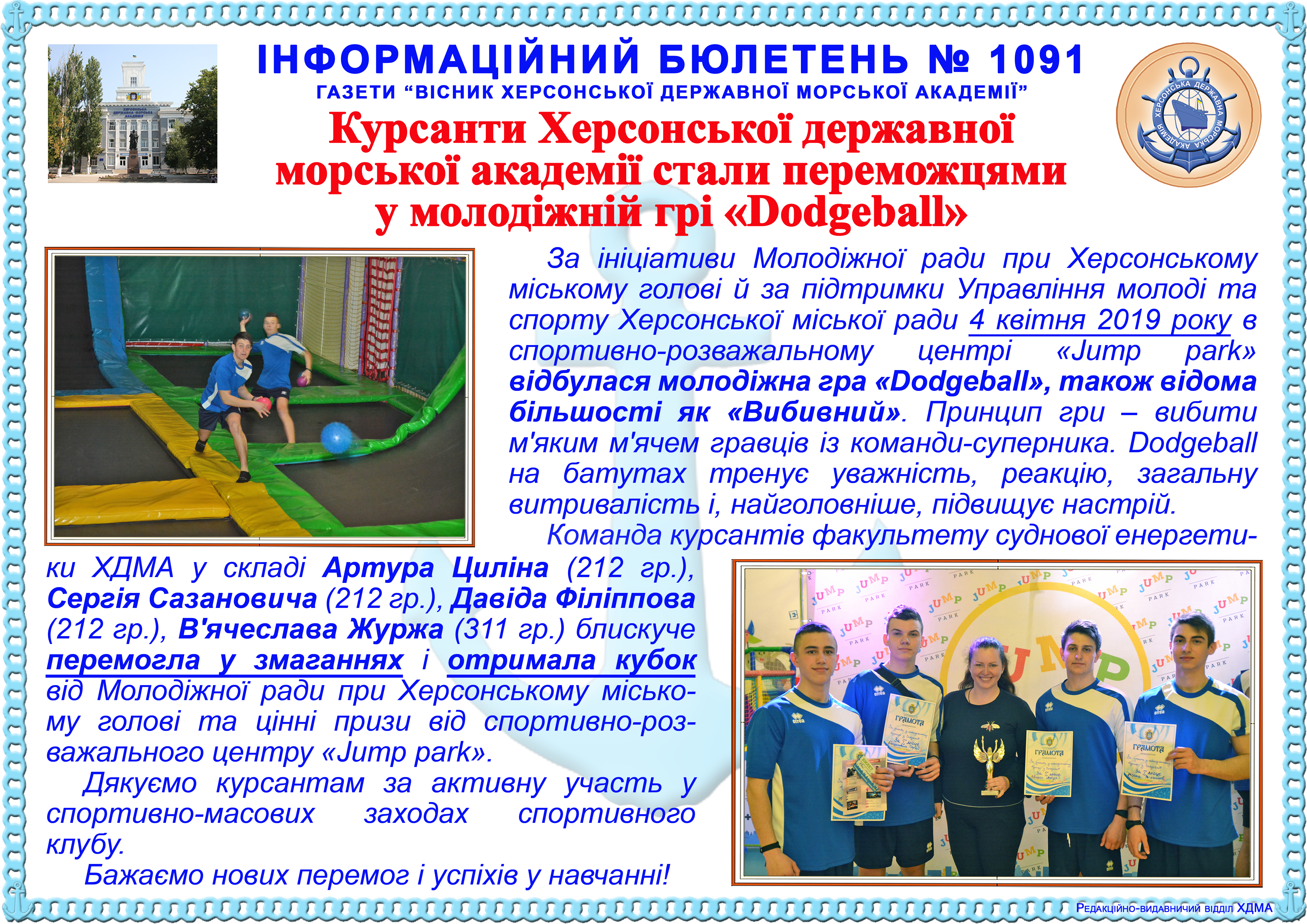 http://repnew.ksma.ks.ua/jspui/handle/123456789/1957| Title: | Інформаційний бюлетень № 1091 Курсанти Херсонської державної морської академії стали переможцями у молодіжній грі «Dodgeball» |