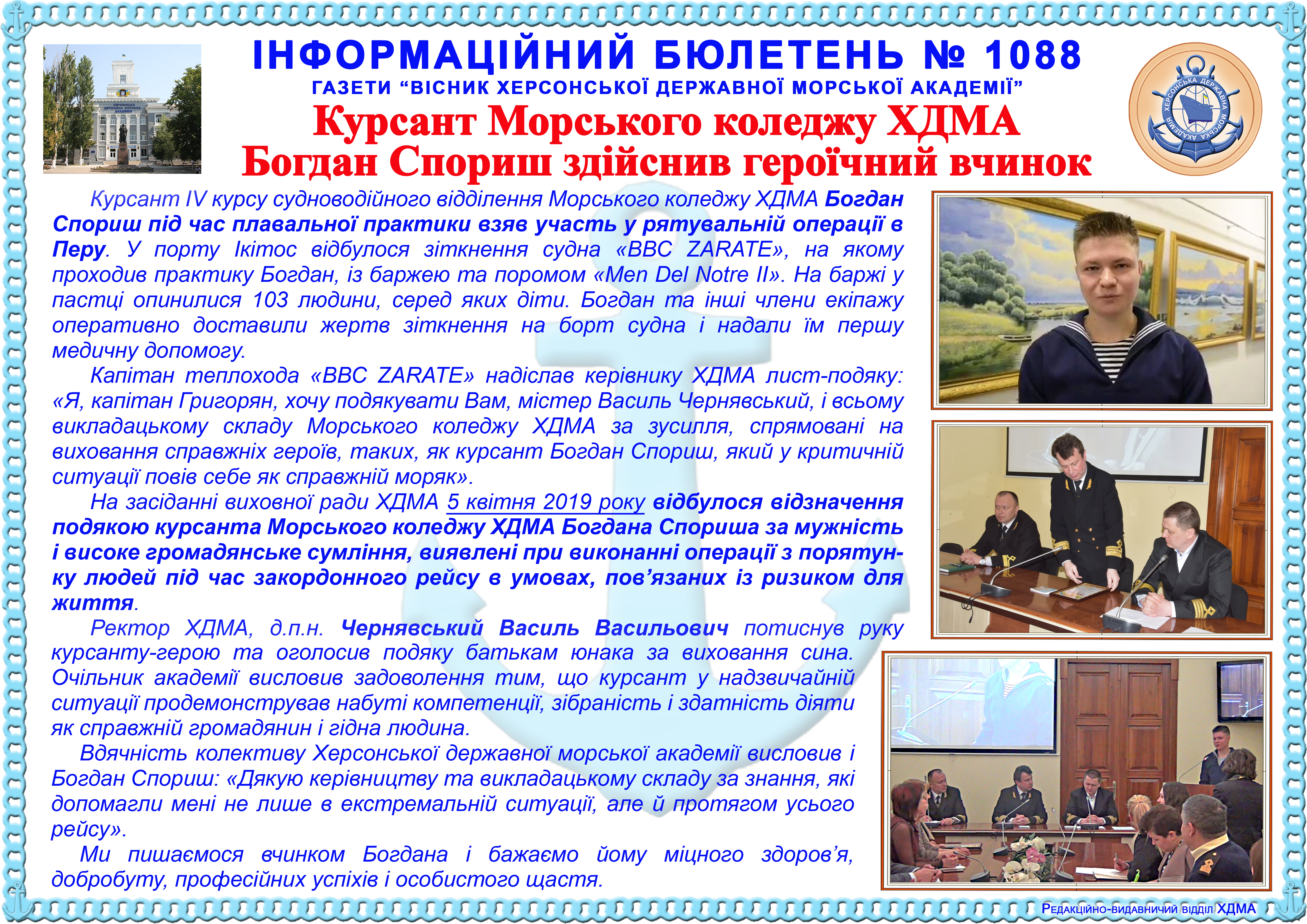 http://repnew.ksma.ks.ua/jspui/handle/123456789/1960| Title: | Інформаційний бюлетень № 1088 Курсант Морського коледжу ХДМА Богдан Спориш здійснив героїчний вчинок |
