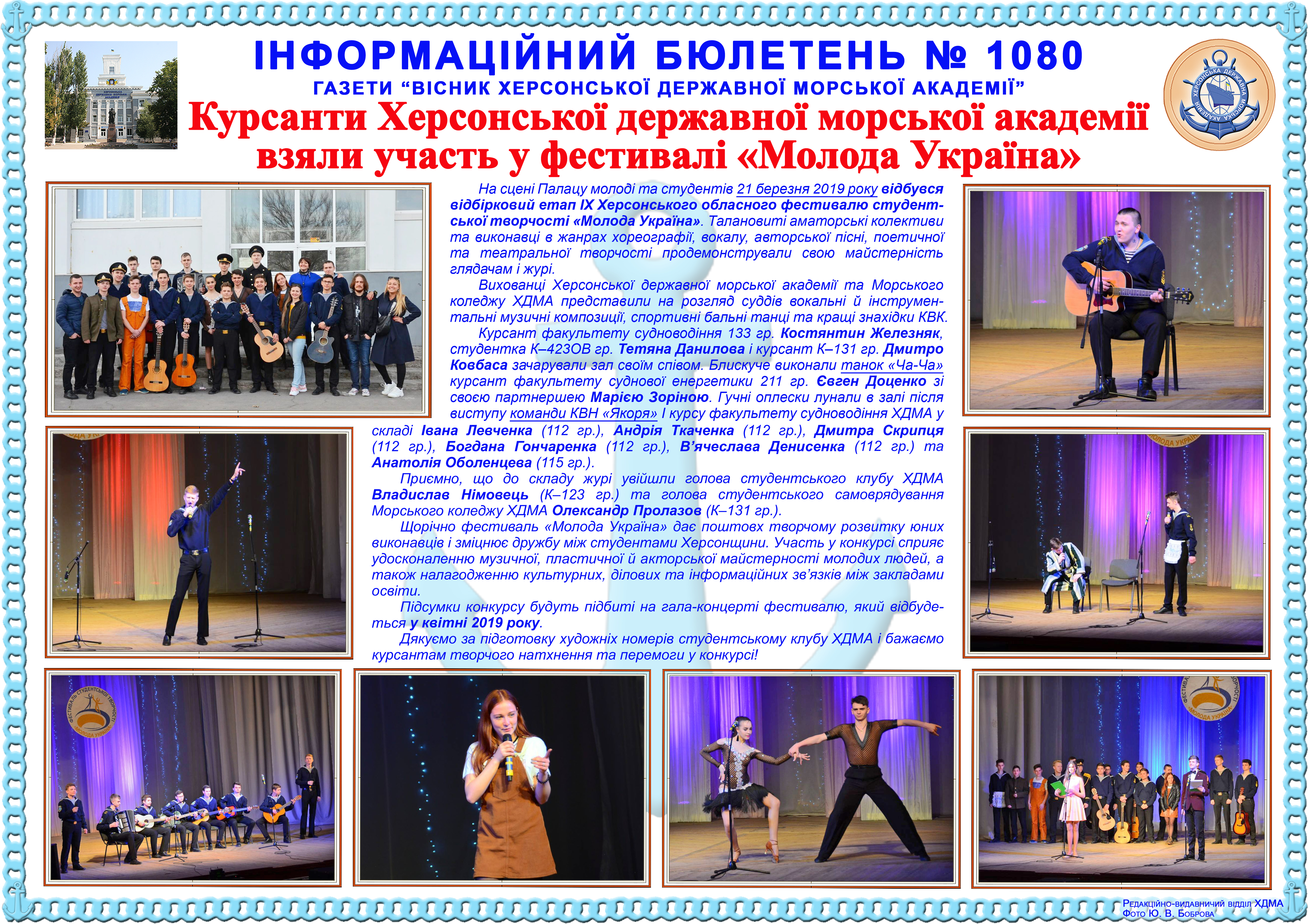 http://repnew.ksma.ks.ua/jspui/handle/123456789/1966| Title: | Інформаційний бюлетень № 1080 Курсанти Херсонської державної морської академії взяли участь у фестивалі «Молода Україна» |