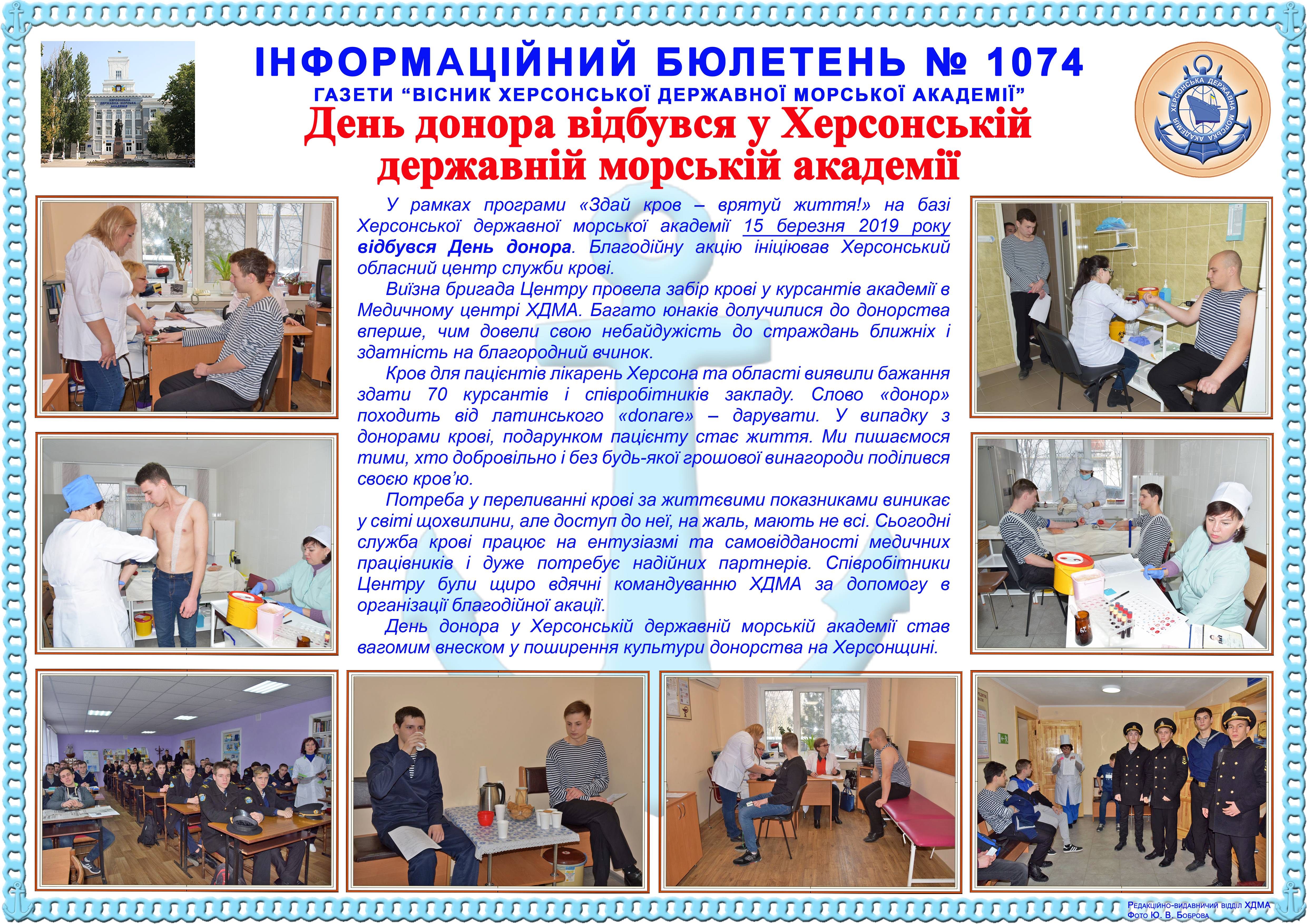http://repnew.ksma.ks.ua/jspui/handle/123456789/1971| Title: | Інформаційний бюлетень № 1074 День донора відбувся у Херсонській державній морській академії |