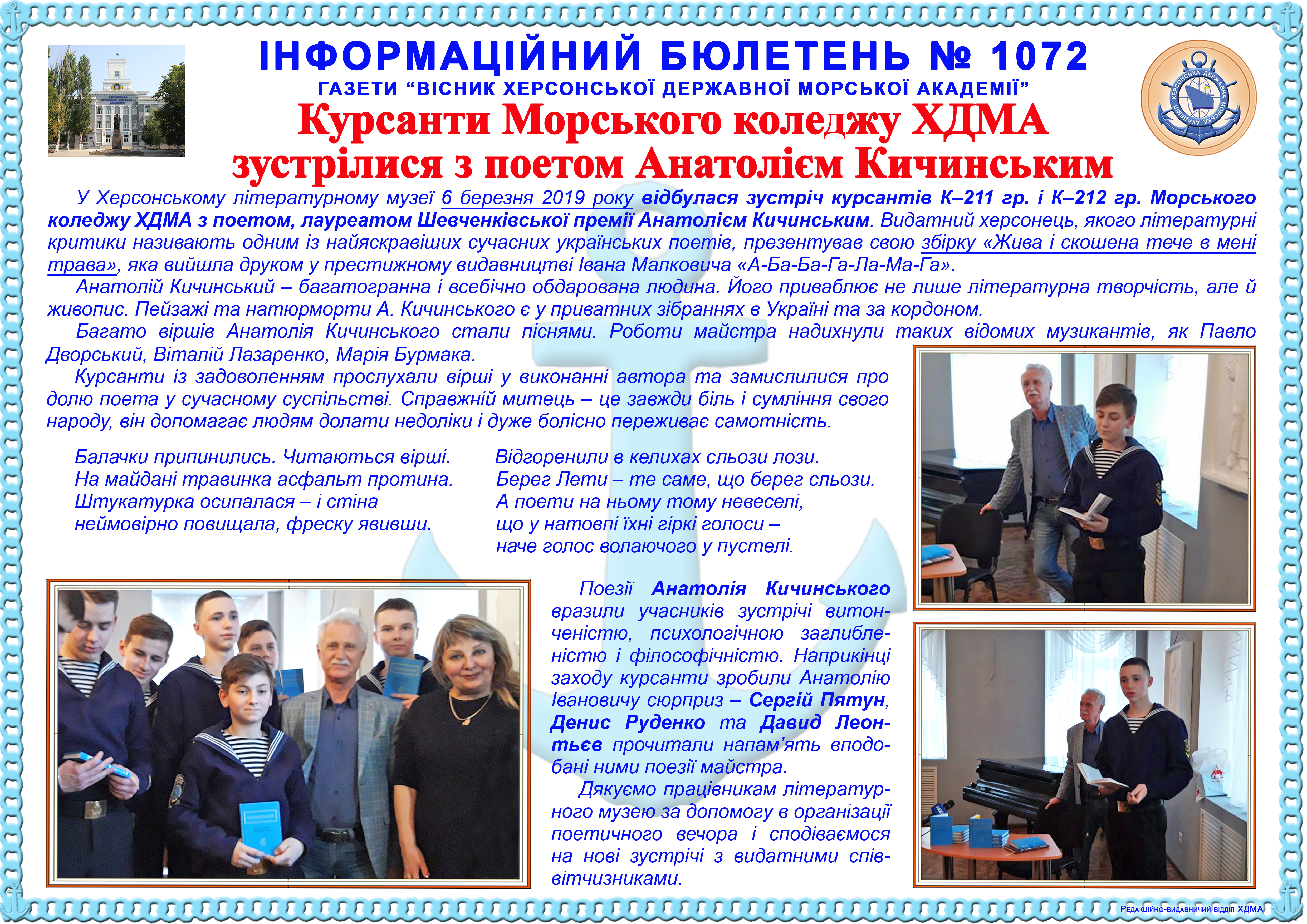 http://repnew.ksma.ks.ua/jspui/handle/123456789/1972| Title: | Інформаційний бюлетень № 1072 Курсанти Морського коледжу ХДМА зустрілися з поетом Анатолієм Кичинським |