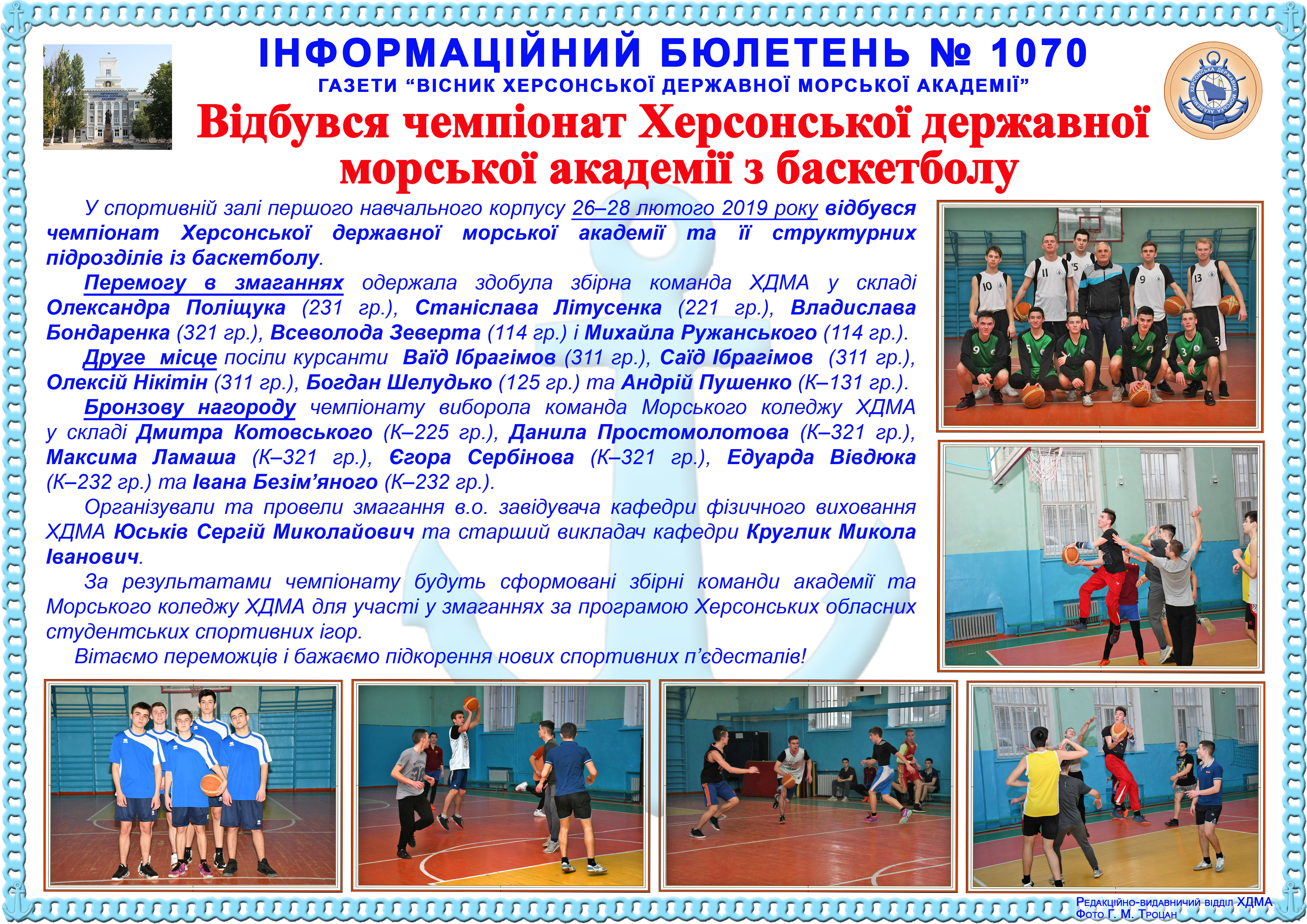 http://repnew.ksma.ks.ua/jspui/handle/123456789/1974| Title: | Інформаційний бюлетень № 1070 Відбувся чемпіонат Херсонської державної орської академії з баскетболу |