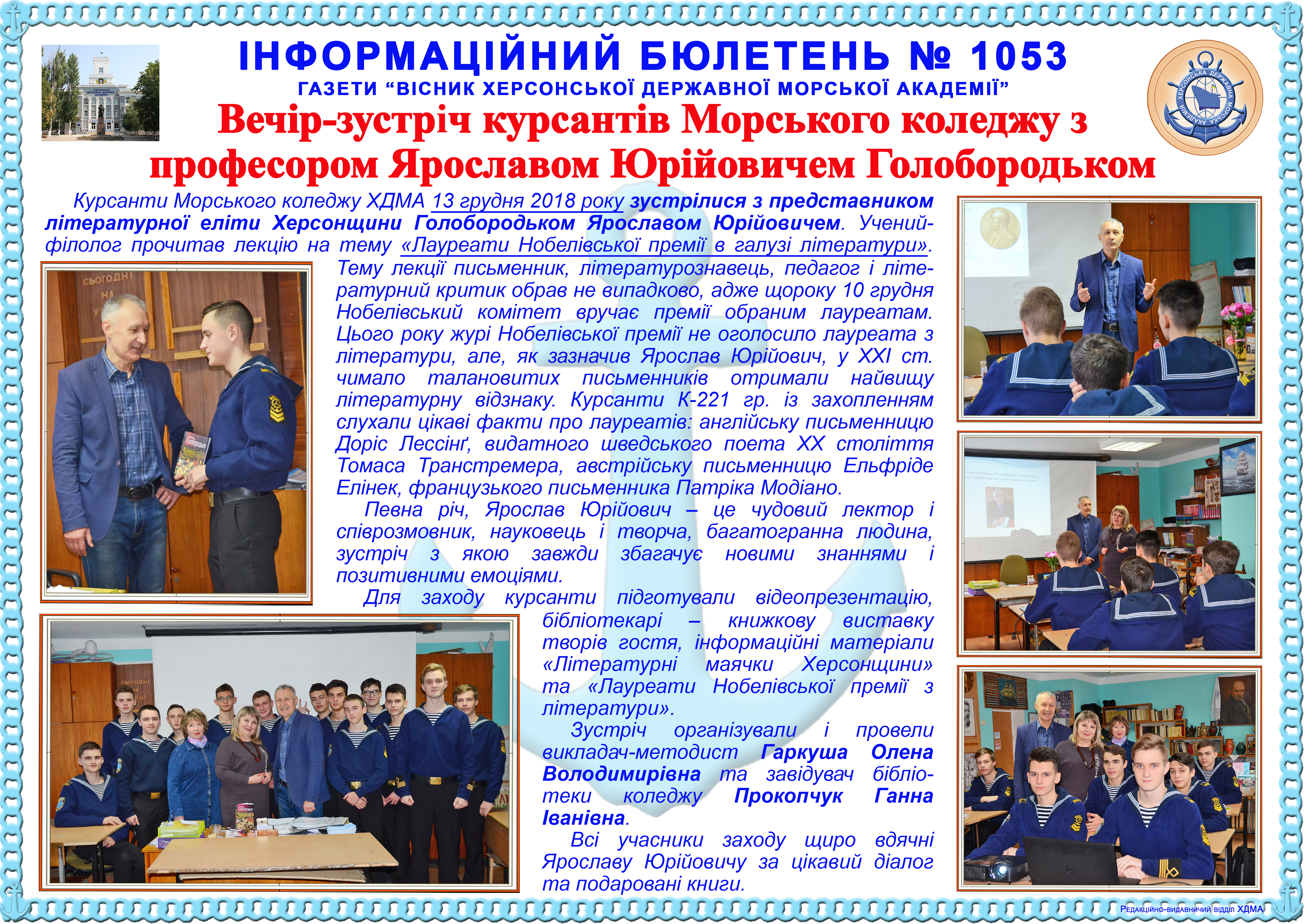 http://repnew.ksma.ks.ua/jspui/handle/123456789/1995| Title: | Інформаційний бюлетень № 1053 Вечір-зустріч курсантів Морського коледжу з професором Ярославом Юрійовичем Голобородьком |