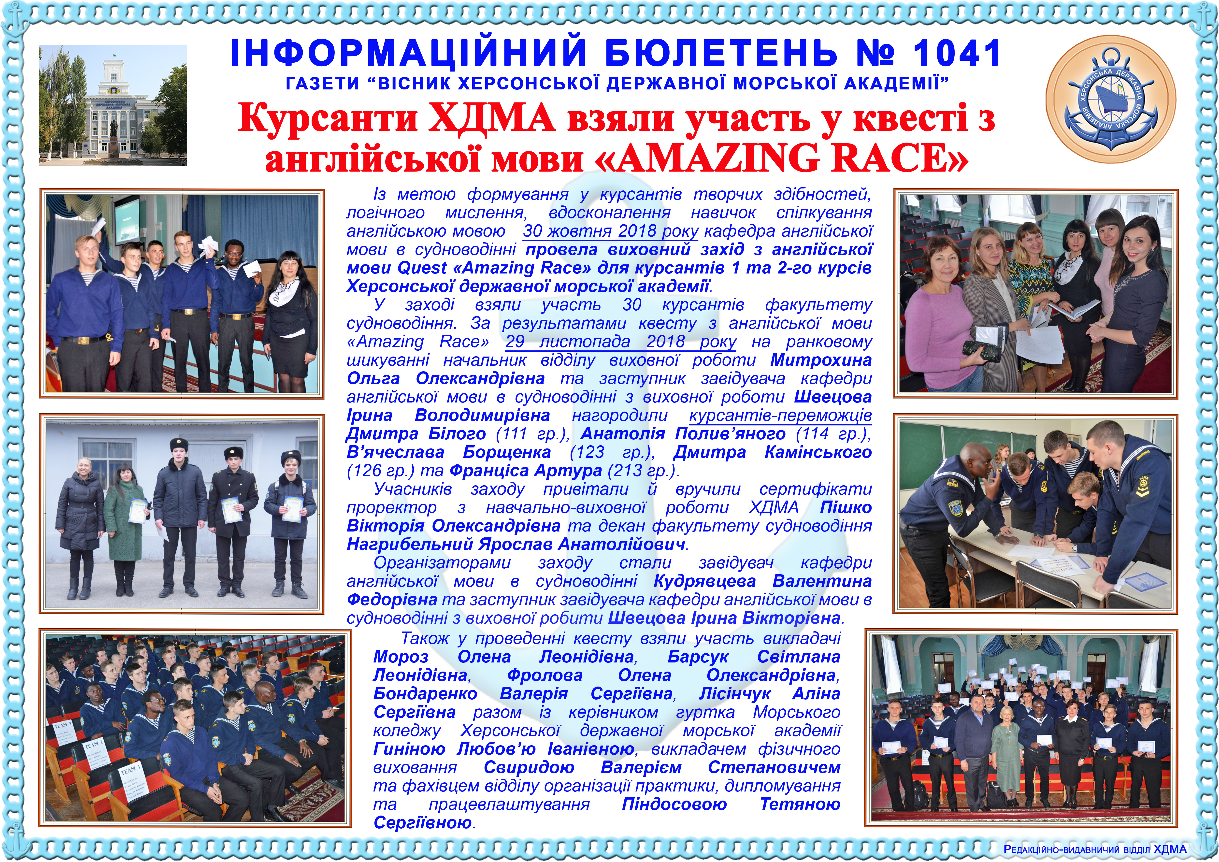 http://repnew.ksma.ks.ua/jspui/handle/123456789/2004| Title: | Інформаційний бюлетень № 1041 Курсанти ХДМА взяли участь у квесті з англійської мови «AMAZING RACE» |