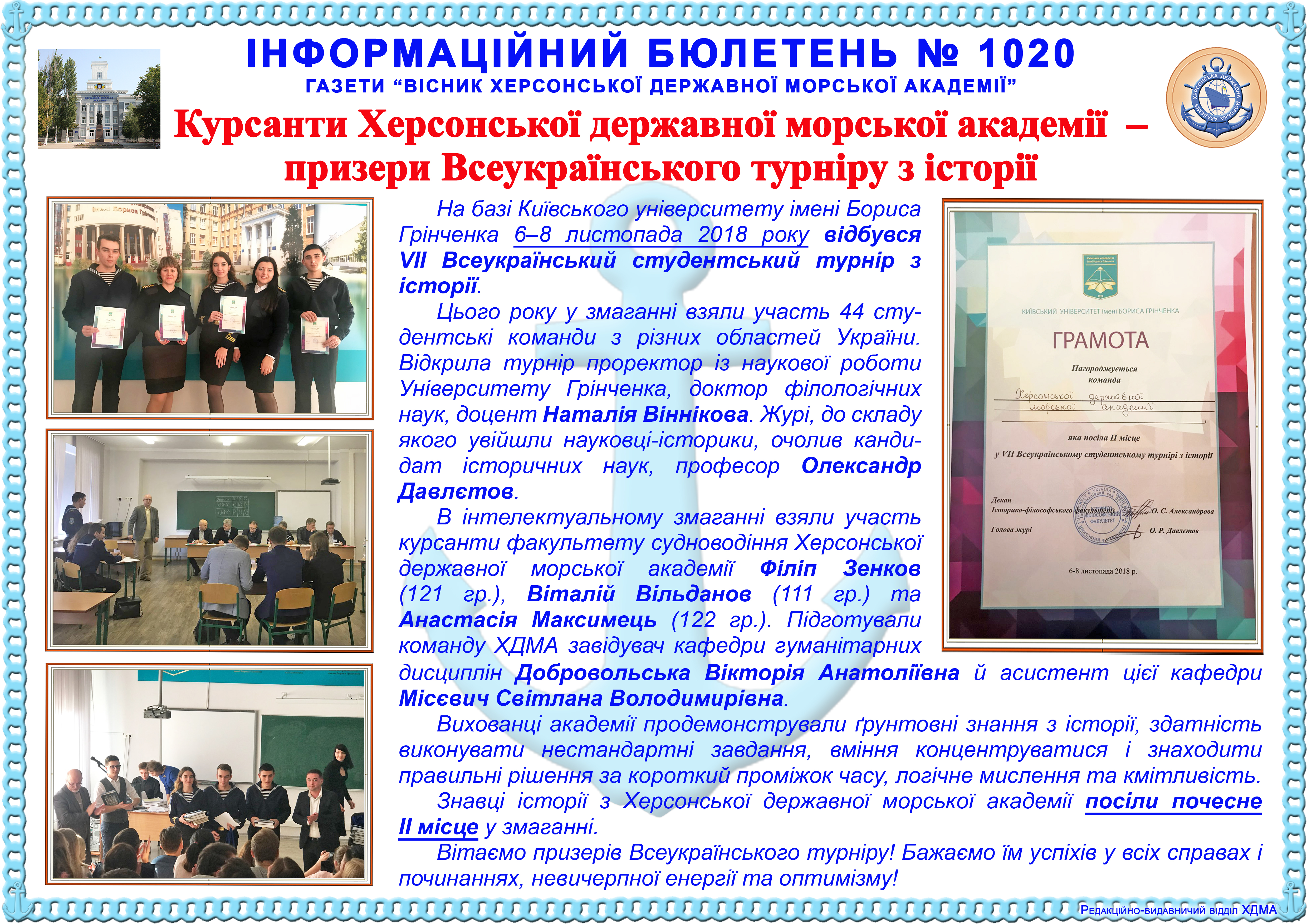 http://repnew.ksma.ks.ua/jspui/handle/123456789/2024| Title: | Інформаційний бюлетень № 1020 Курсанти Херсонської державної морської академії – призери Всеукраїнського турніру з історії |