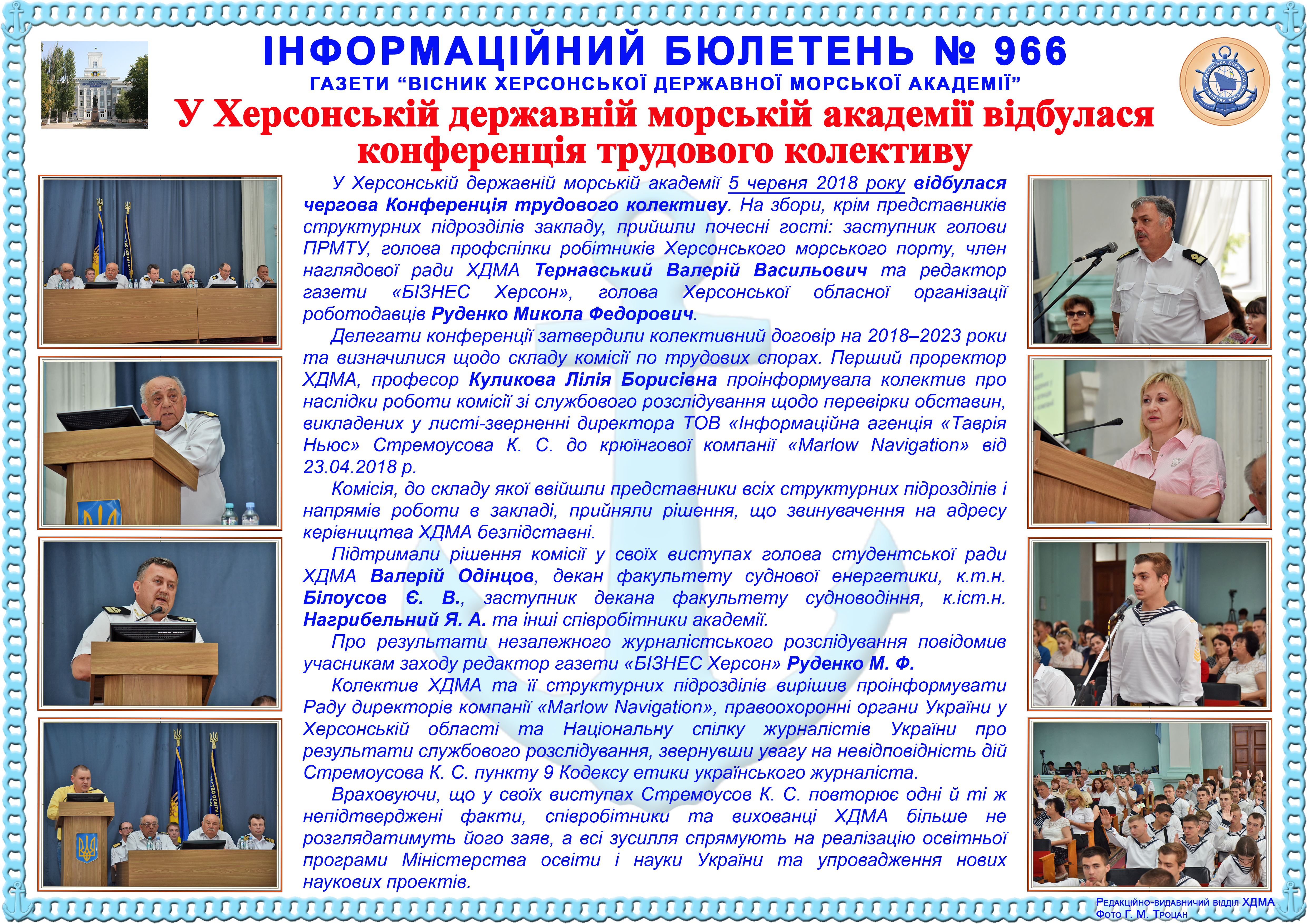 http://repnew.ksma.ks.ua/jspui/handle/123456789/2088| Title: | Інформаційний бюлетень № 966 У Херсонській державній морській академії відбулася конференція трудового колективу |