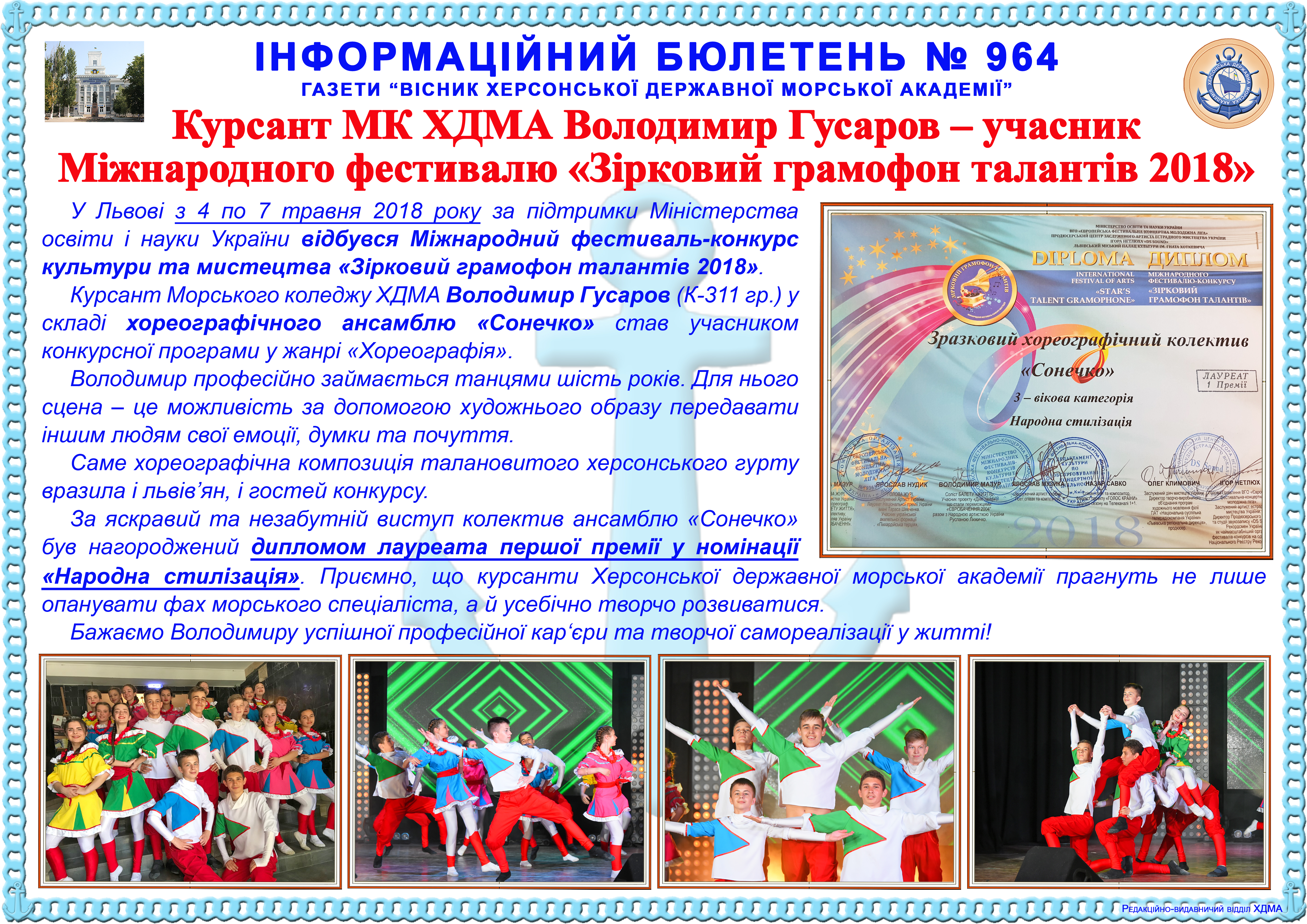 Title: Інформаційний бюлетень № 964 Курсант МК ХДМА Володимир Гусаров – учасник Міжнародного фестивалю «Зірковий грамофон талантів 2018»