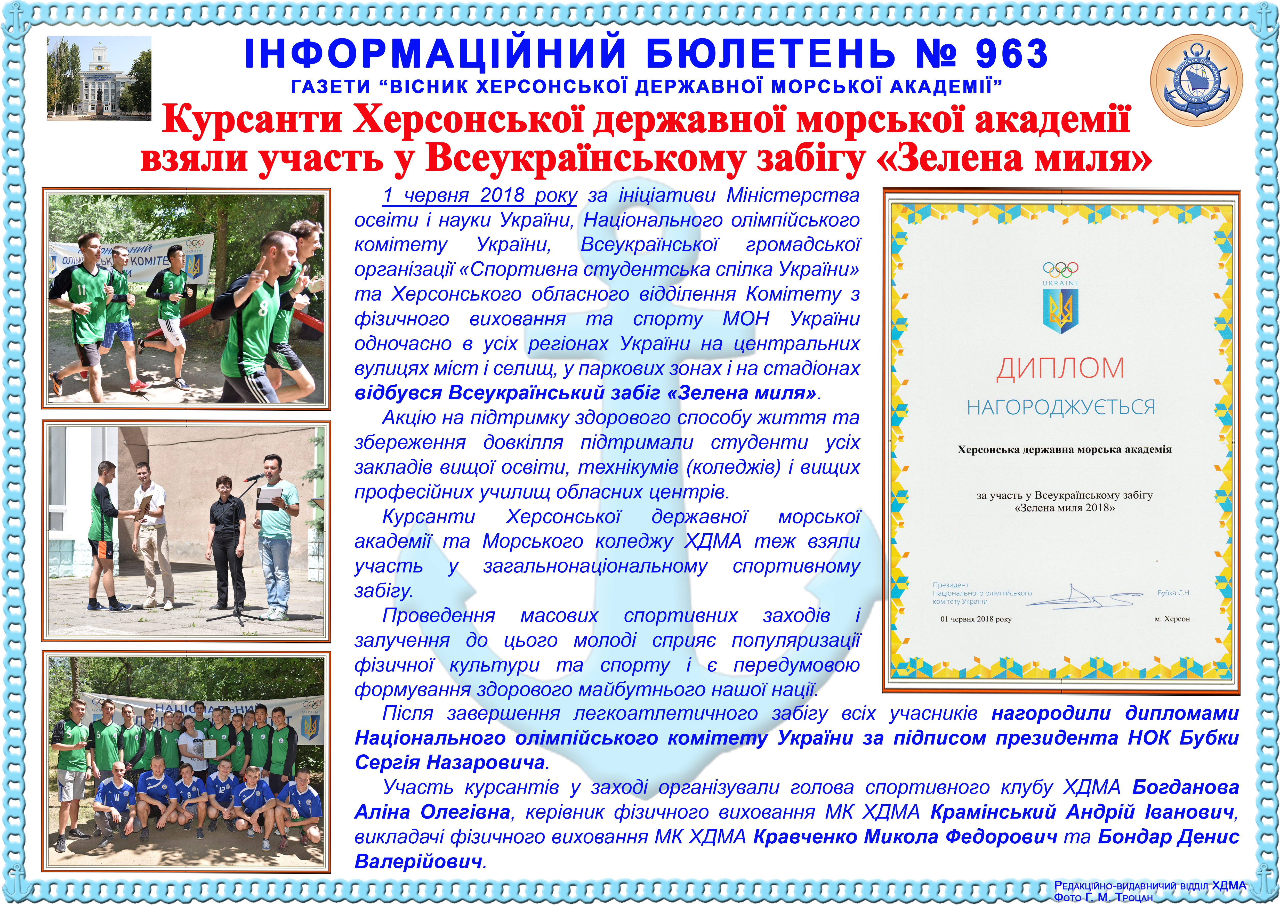 http://repnew.ksma.ks.ua/jspui/handle/123456789/2091| Title: | Інформаційний бюлетень № 963 Курсанти Херсонської державної морської академії взяли участь у Всеукраїнському забігу «Зелена миля» |