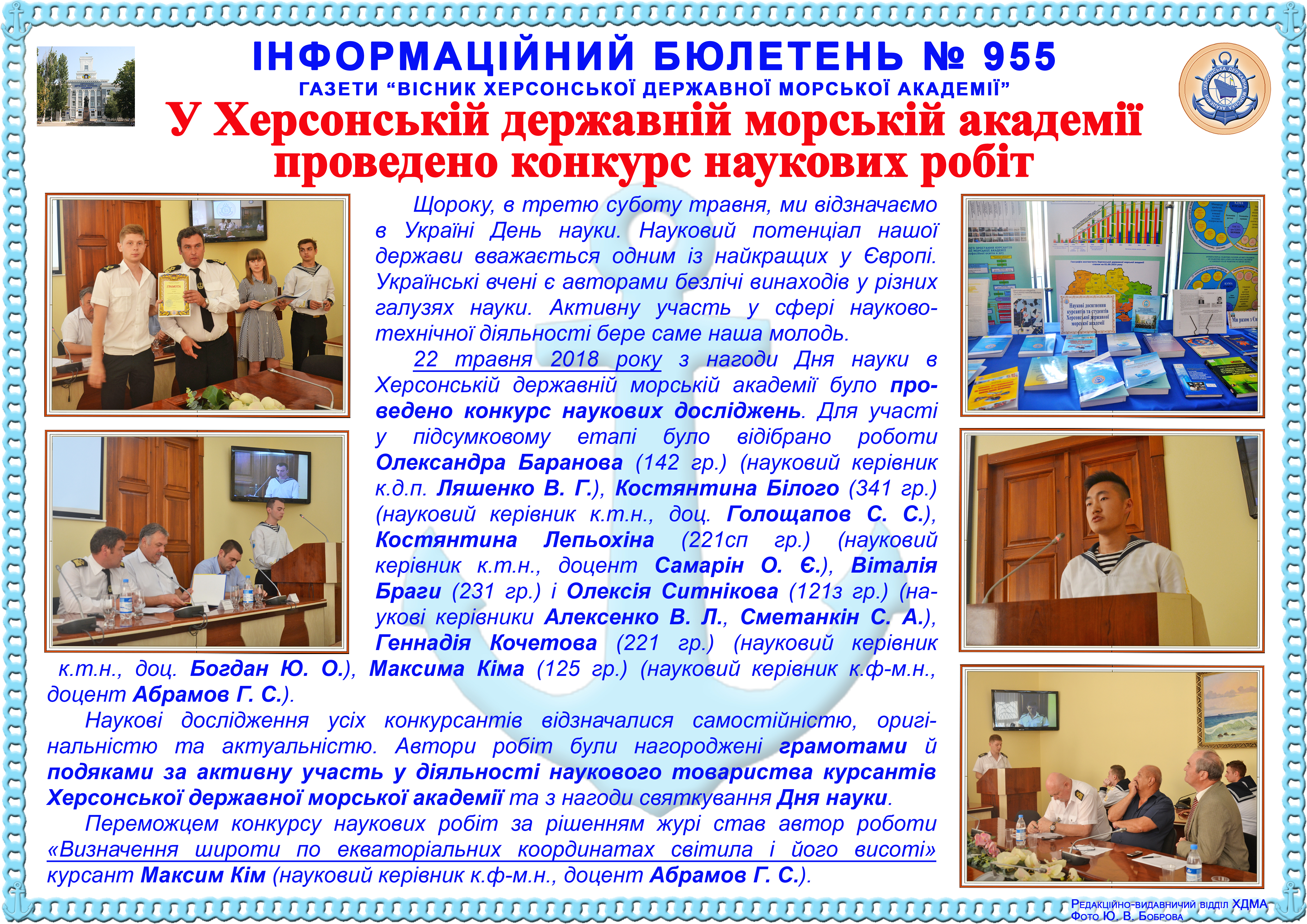 http://repnew.ksma.ks.ua/jspui/handle/123456789/2098| Title: | Інформаційний бюлетень № 955 У Херсонській державній морській академії проведено конкурс наукових робіт |