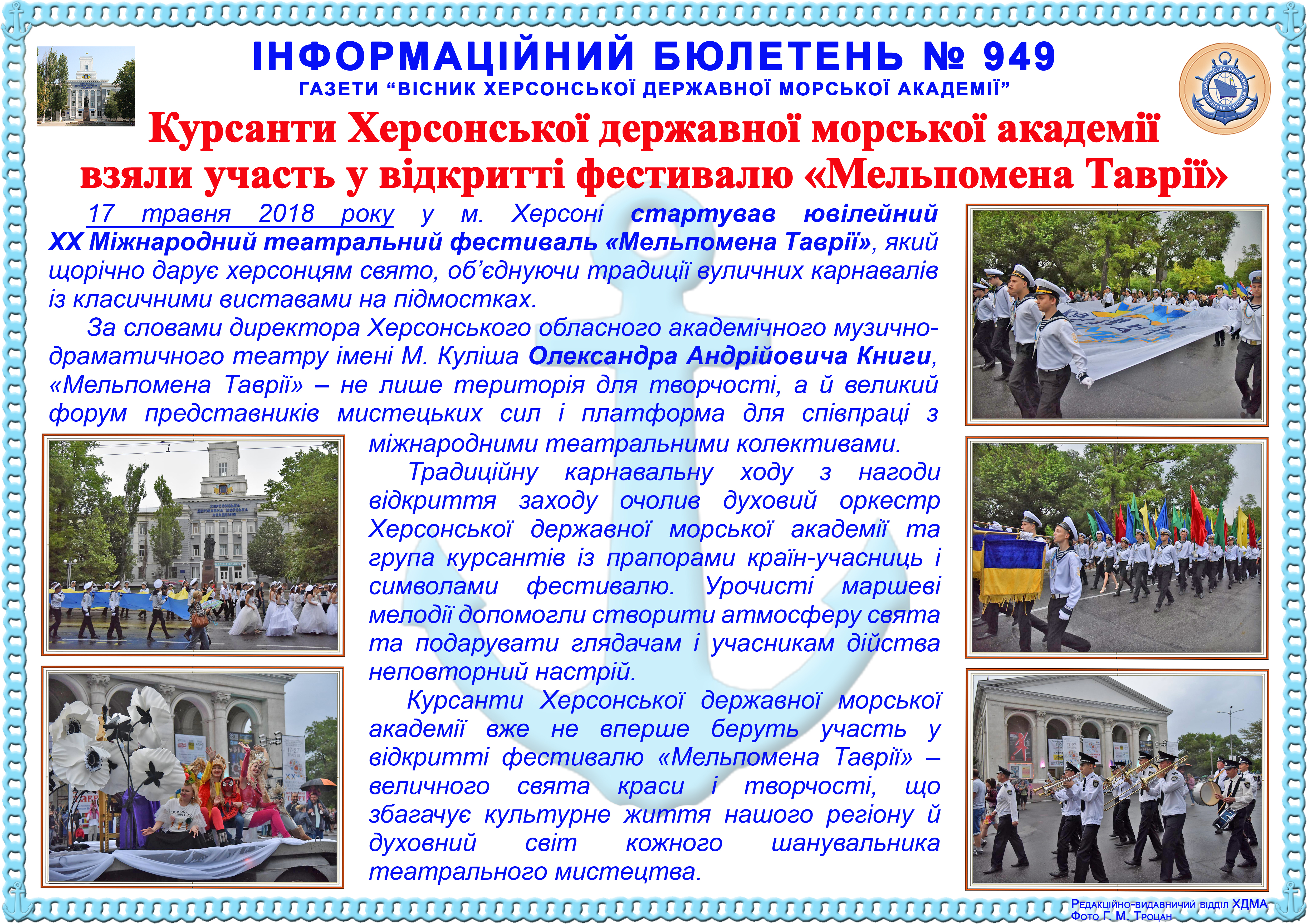 http://repnew.ksma.ks.ua/jspui/handle/123456789/2103| Title: | Інформаційний бюлетень № 949 Курсанти Херсонської державної морської академії взяли участь у відкритті фестивалю «Мельпомена Таврії» |