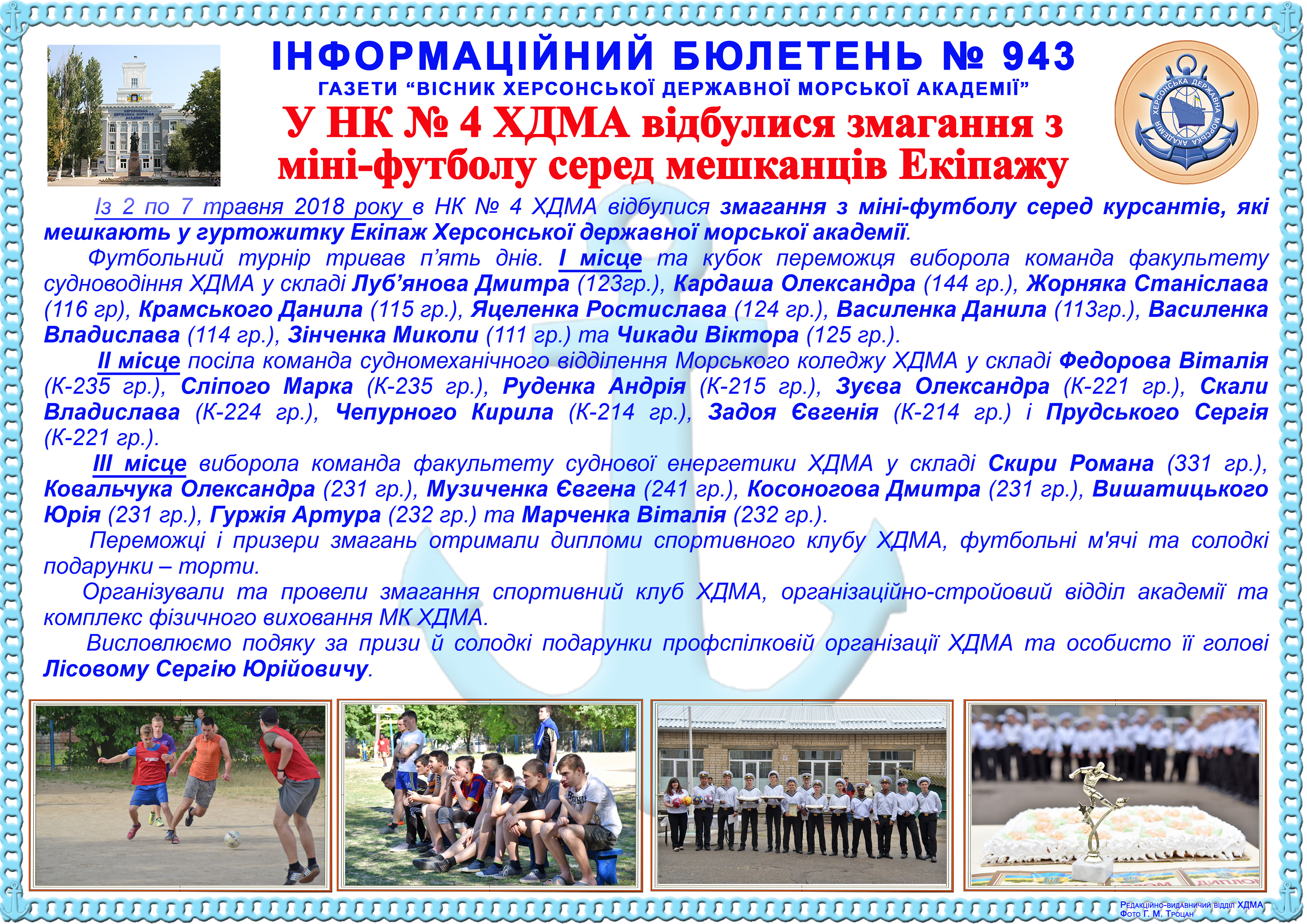 http://repnew.ksma.ks.ua/jspui/handle/123456789/2107| Title: | Інформаційний бюлетень № 943 У НК № 4 ХДМА відбулися змагання з міні-футболу серед мешканців Екіпажу |
