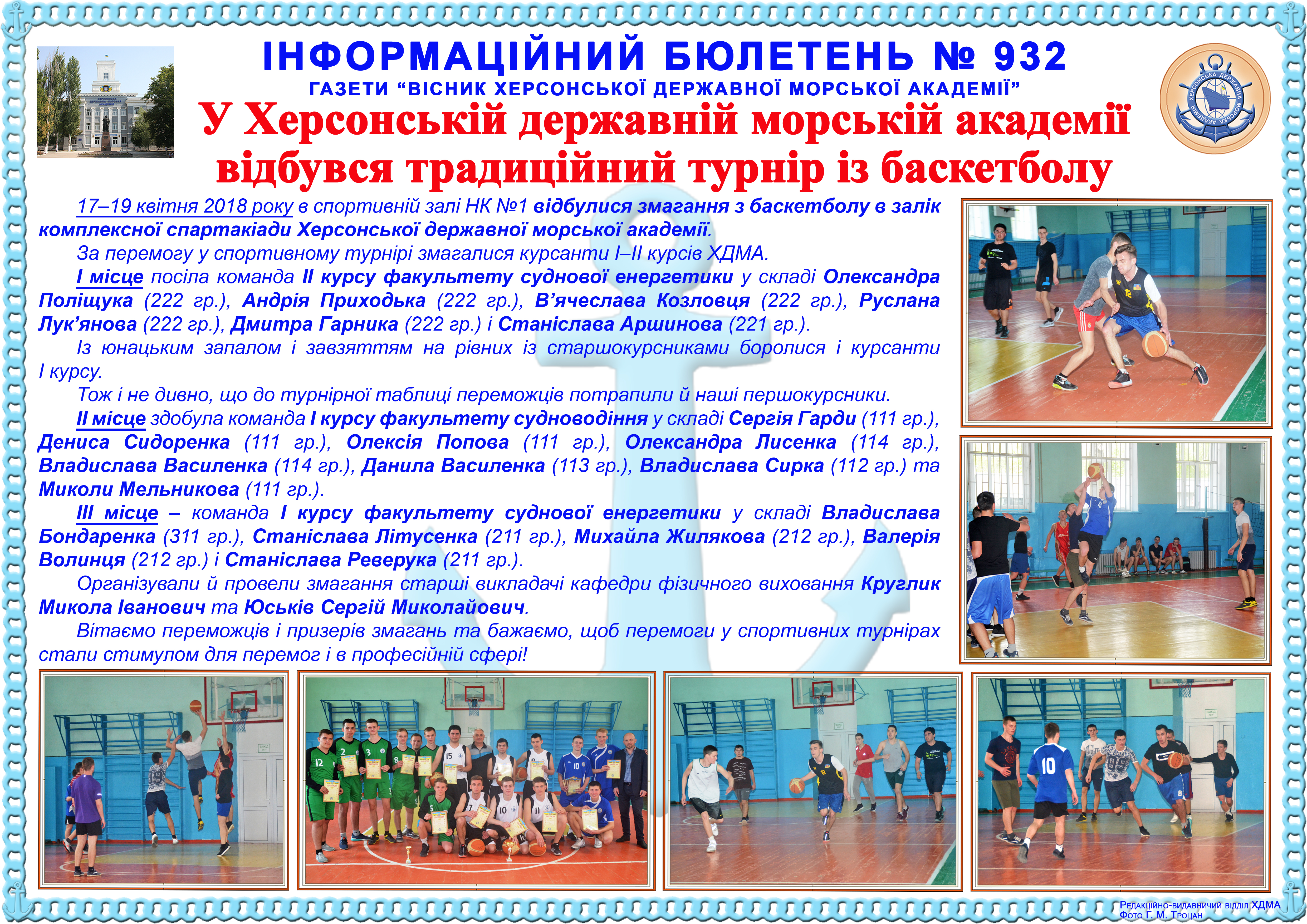 http://repnew.ksma.ks.ua/jspui/handle/123456789/2124| Title: | Інформаційний бюлетень № 932 У Херсонській державній морській академії відбувся традиційний турнір із баскетболу |