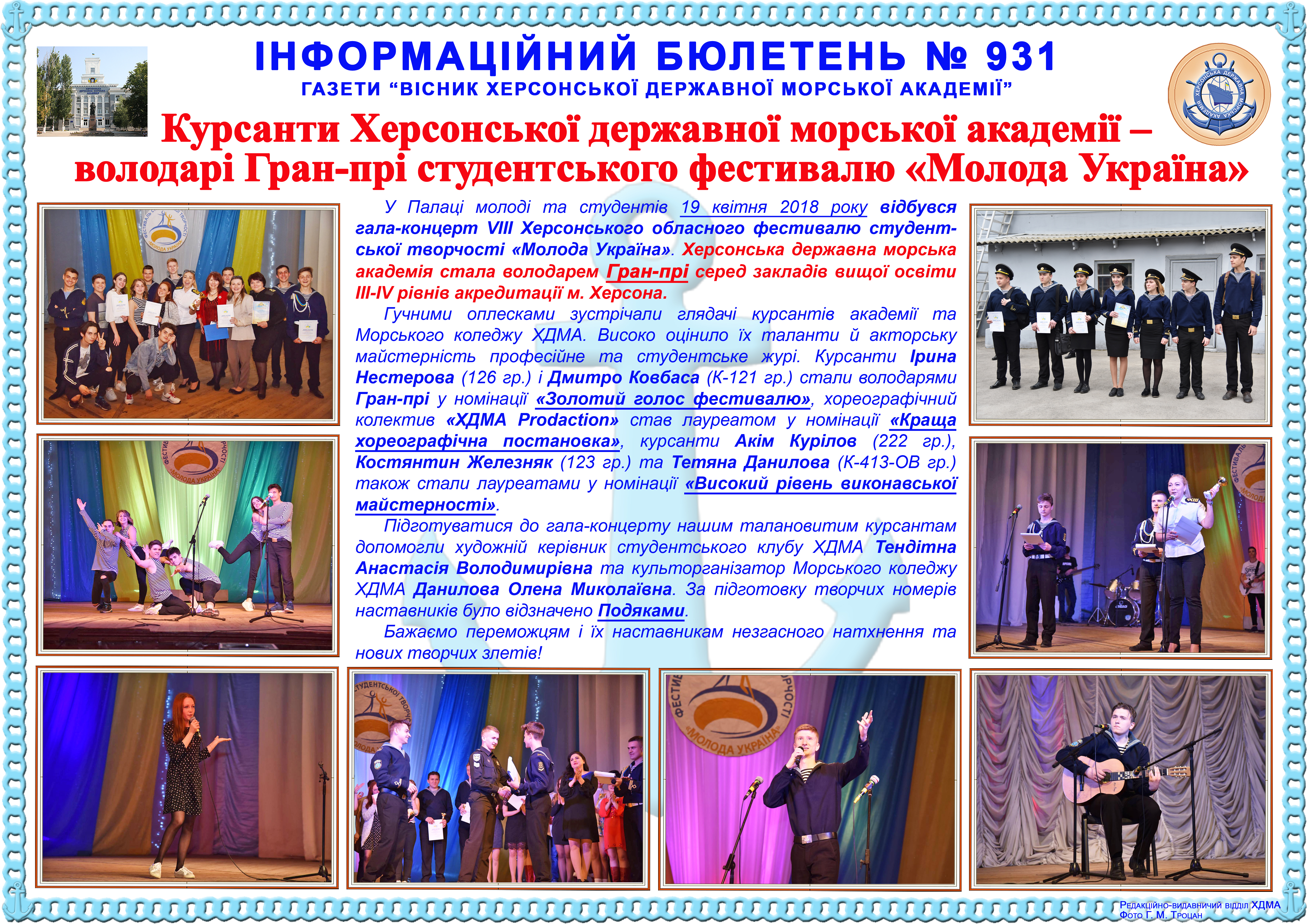http://repnew.ksma.ks.ua/jspui/handle/123456789/2125| Title: | Інформаційний бюлетень № 931 Курсанти Херсонської державної морської академії – володарі Гран-прі студентського фестивалю «Молода Україна» |