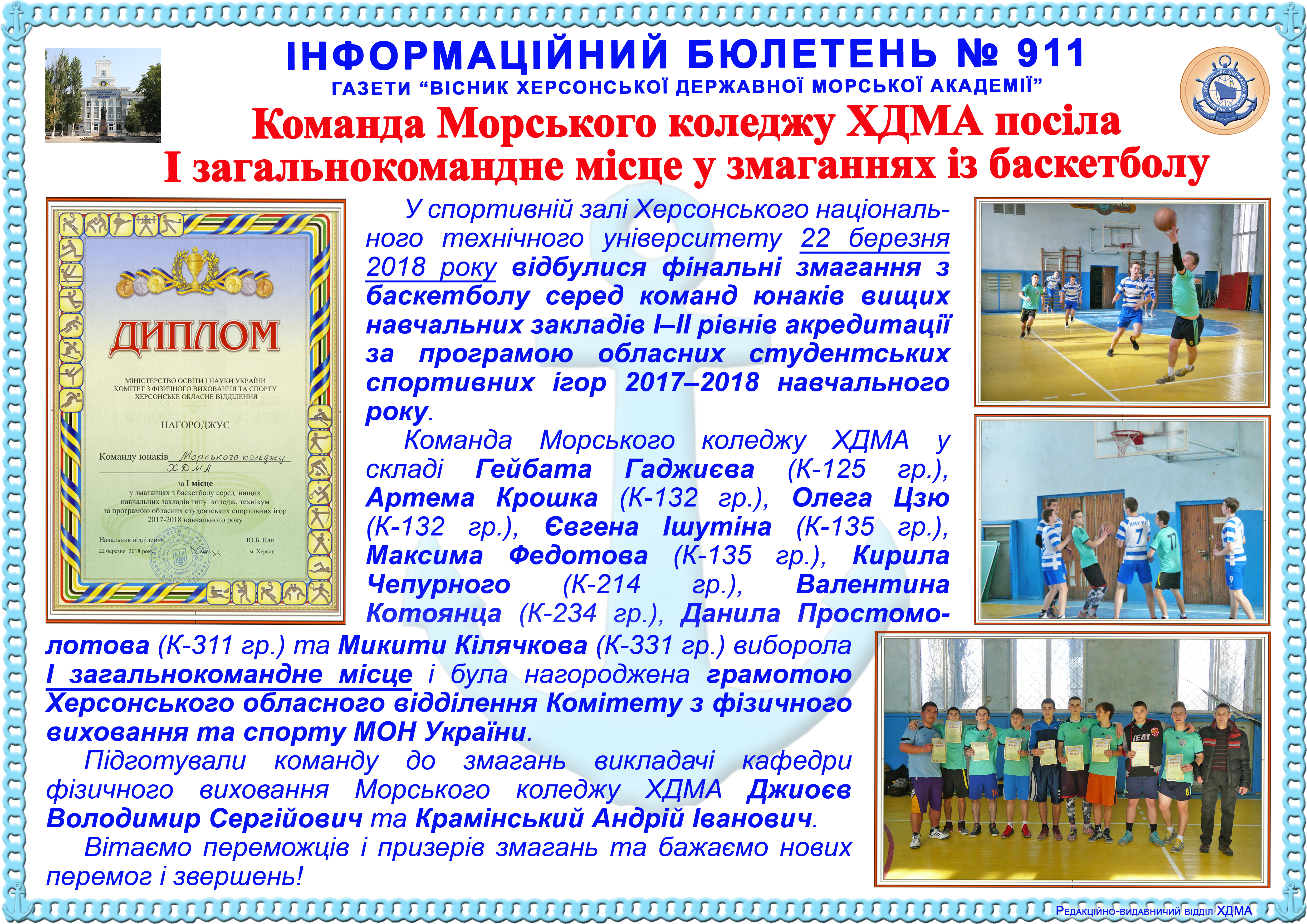 http://repnew.ksma.ks.ua/jspui/handle/123456789/2141| Title: | Інформаційний бюлетень № 911 Команда Морського коледжу ХДМА посіла І загальнокомандне місце у змаганнях із баскетболу |