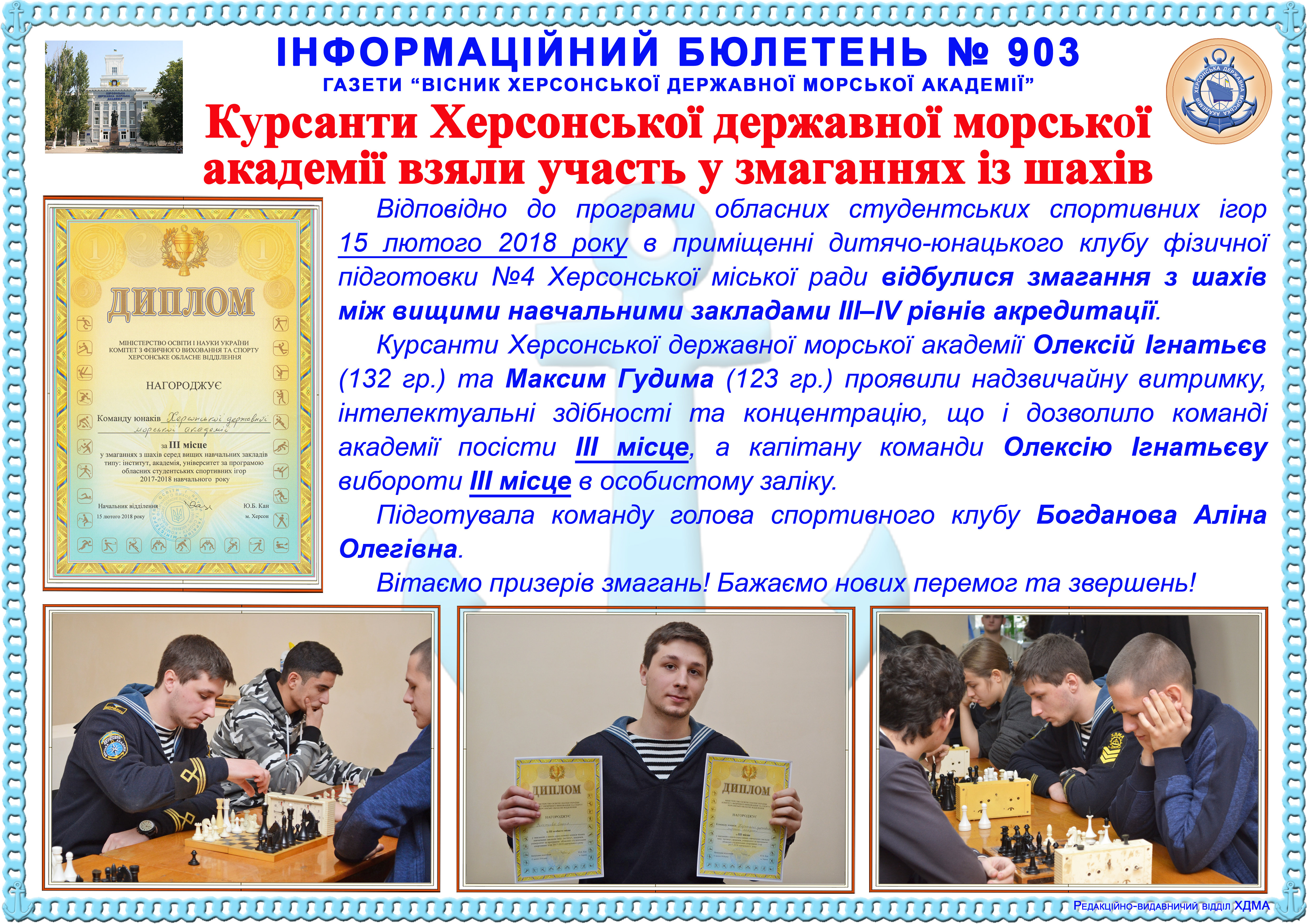 http://repnew.ksma.ks.ua/jspui/handle/123456789/2146| Title: | Інформаційний бюлетень № 903 Курсанти Херсонської державної морської академії взяли участь у змаганнях із шахів |