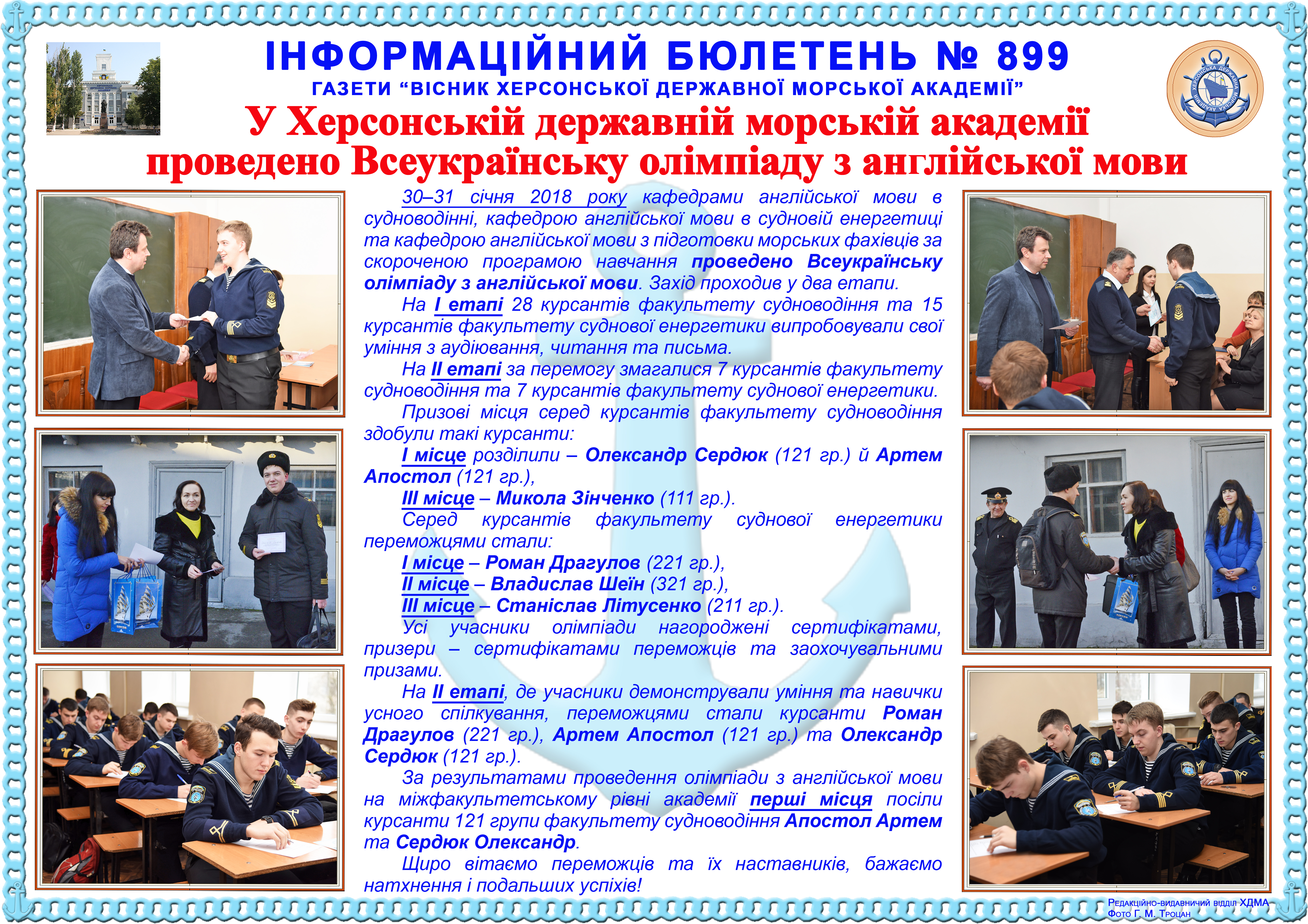 http://repnew.ksma.ks.ua/jspui/handle/123456789/2150| Title: | Інформаційний бюлетень № 899 У Херсонській державній морській академії проведено Всеукраїнську олімпіаду з англійської мови |