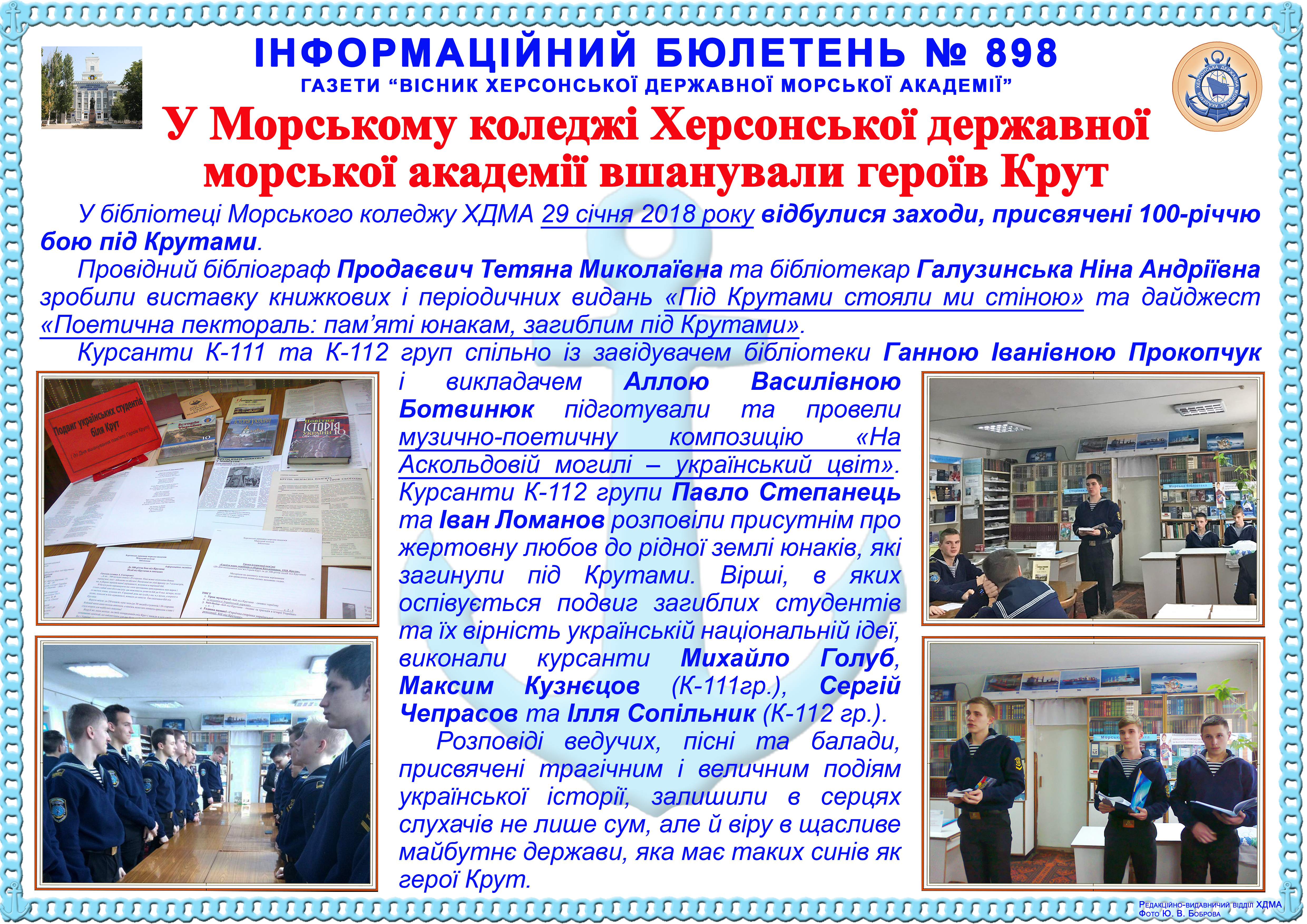 http://repnew.ksma.ks.ua/jspui/handle/123456789/2151| Title: | Інформаційний бюлетень № 898 У Морському коледжі Херсонської державної морської академії вшанували героїв Крут |