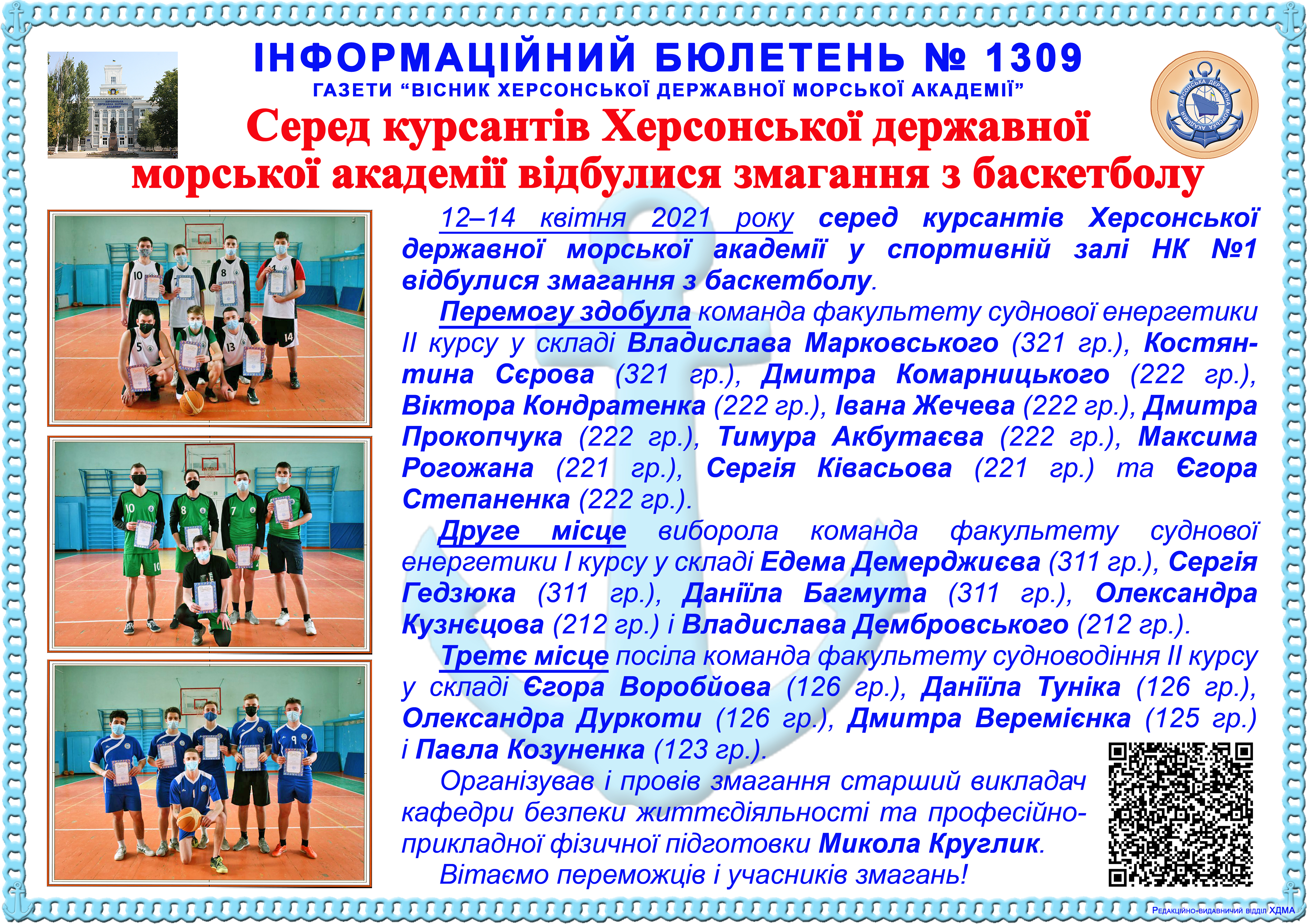 http://repnew.ksma.ks.ua/jspui/handle/123456789/2165| Title: | Інформаційний бюлетень № 1309 Серед курсантів Херсонської державної морської академії відбулися змагання з баскетболу |