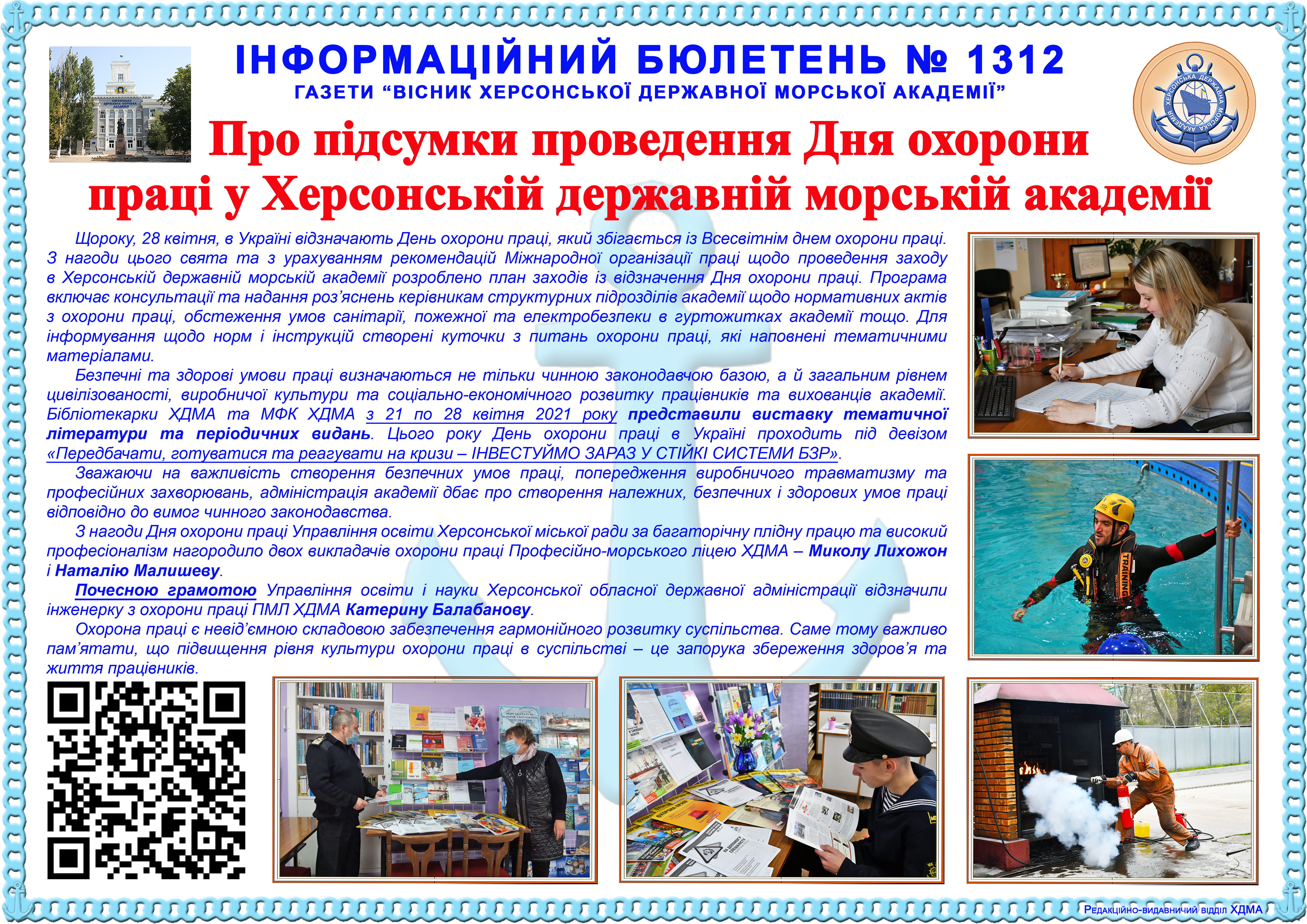 http://repnew.ksma.ks.ua/jspui/handle/123456789/2167| Title: | Інформаційний бюлетень № 1312 Про підсумки проведення Дня охорони праці у Херсонській державній морській академії |