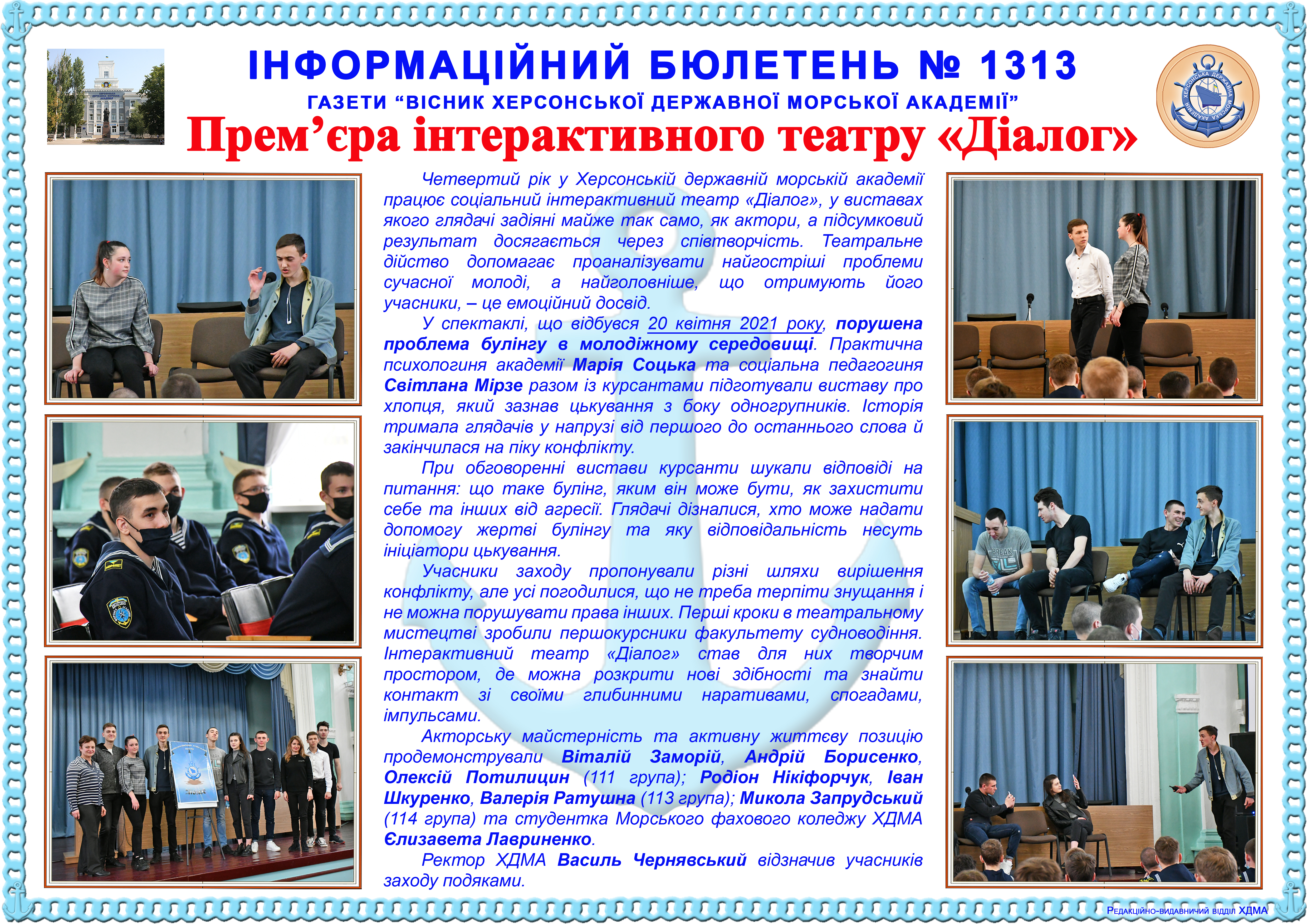 http://repnew.ksma.ks.ua/jspui/handle/123456789/2168| Title: | Інформаційний бюлетень № 1313 Прем’єра інтерактивного театру «Діалог» |