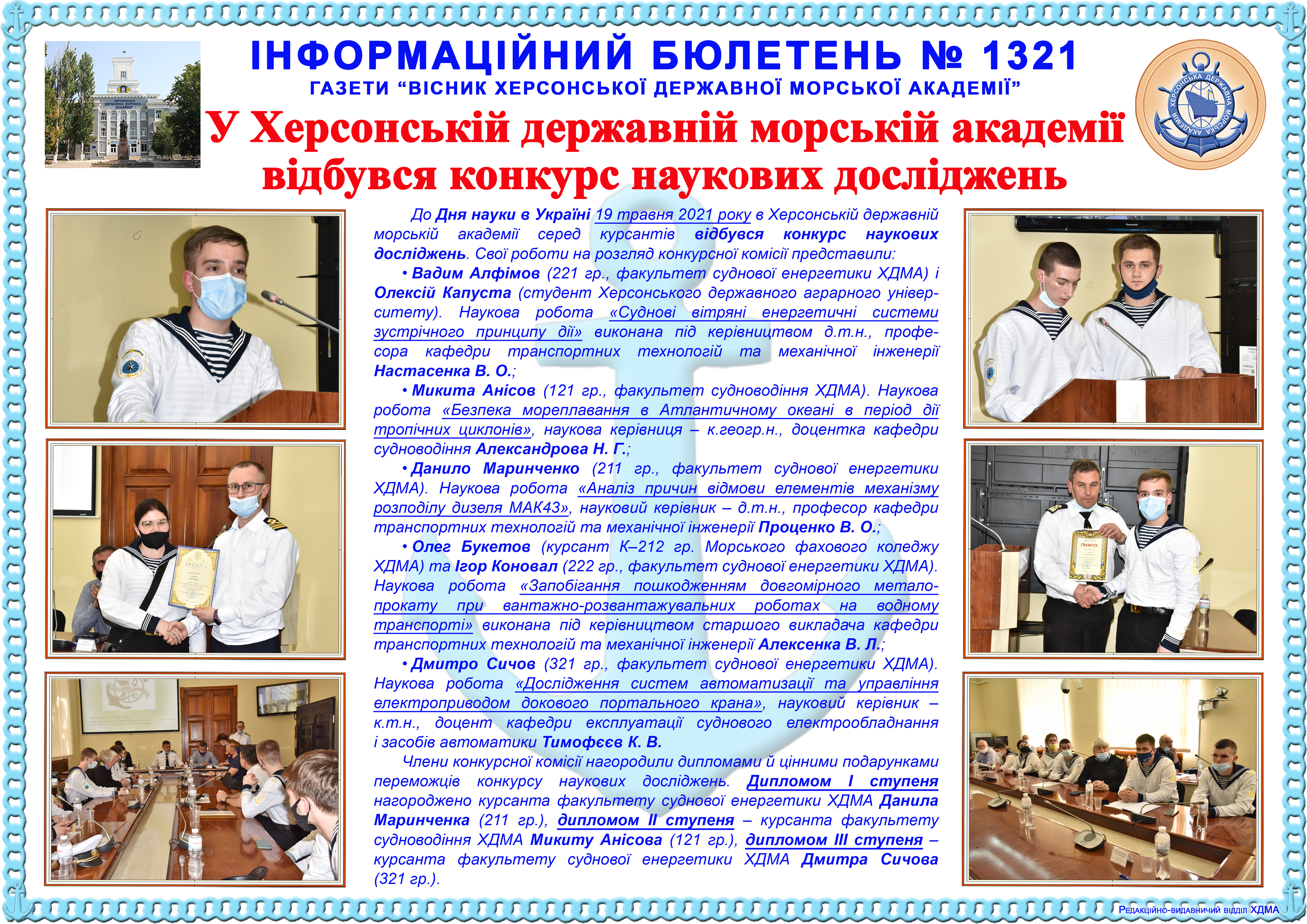http://repnew.ksma.ks.ua/jspui/handle/123456789/2246| Title: | Інформаційний бюлетень № 1321 У Херсонській державній морській академії відбувся конкурс наукових досліджень |