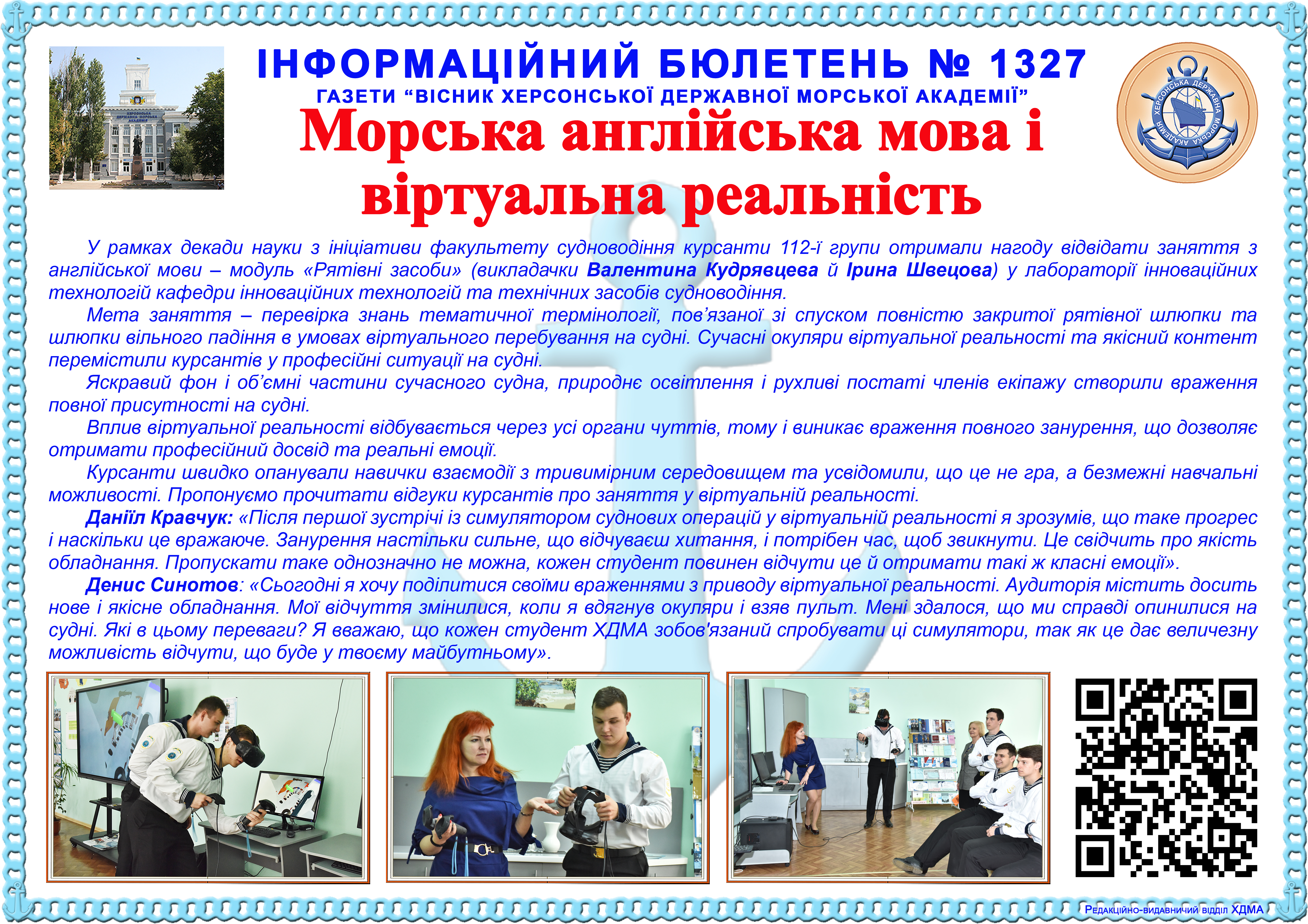 http://repnew.ksma.ks.ua/jspui/handle/123456789/2251| Title: | Інформаційний бюлетень № 1327 Морська англійська мова і віртуальна реальність |
