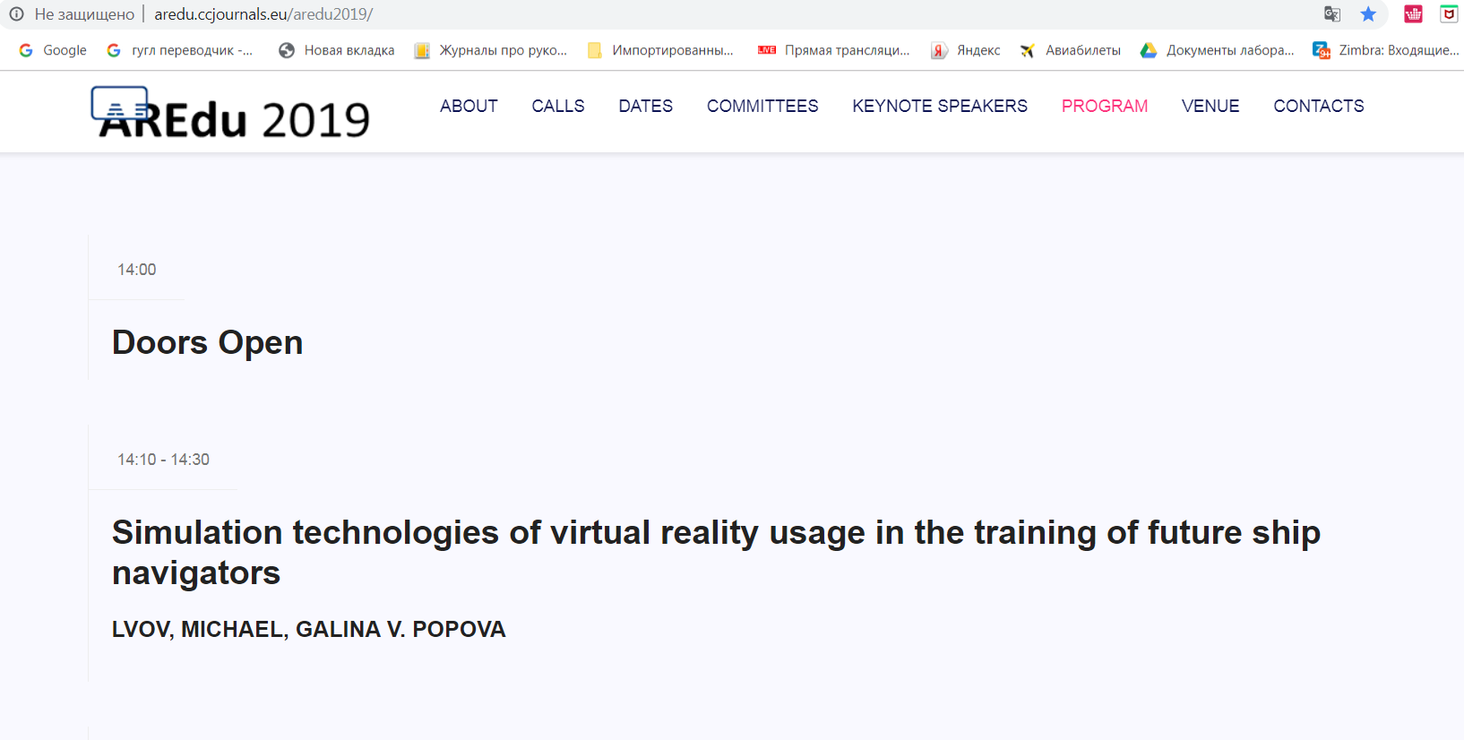 | Citation: | Lvov, M., Popova, H.: Simulation technologies of virtual reality usage in the training of future ship navigators In: Kiv, A.E., Shyshkina, M.P. (eds.) Proceedings of the 2nd International Workshop on Augmented Reality in Education (AREdu 2019), Kryvyi Rih, Ukraine, March 22, 2019.CEUR Workshop Proceedings 2547, 50-65. http://www.ceur-ws.org/Vol-2547/?fbclid=IwAR0mbteaikhAmqAGIvoQeBRjsVFNr4jGTJF8jskEhjnXr7oV6o2C5kYS-X4 (2019). Accessed 10 Feb 2020 |