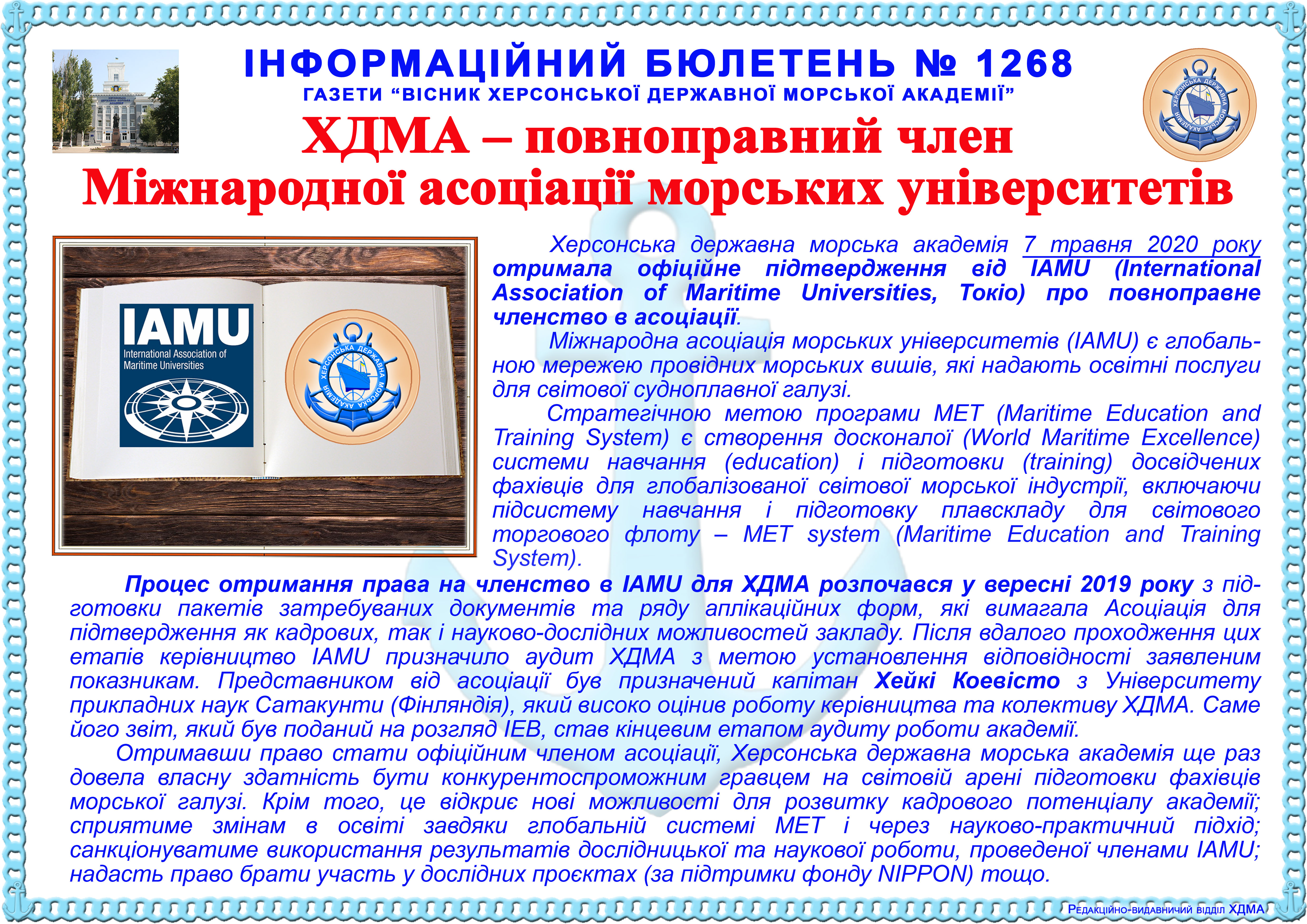 http://repnew.ksma.ks.ua/jspui/handle/123456789/1652| Title: | Іфнормаційний бюллетень № 1268 ХДМА – повноправний член Міжнародної асоціації морських університетів |